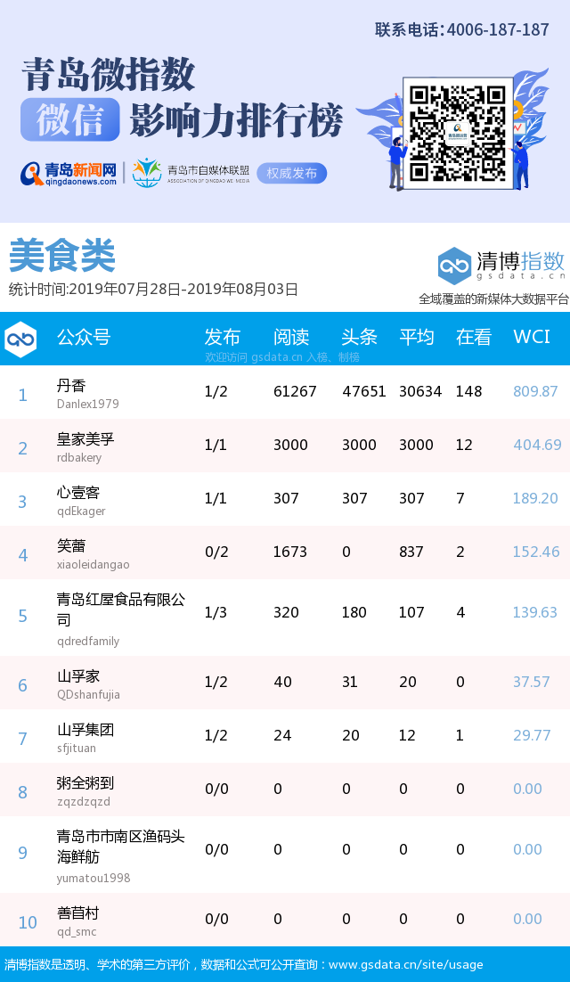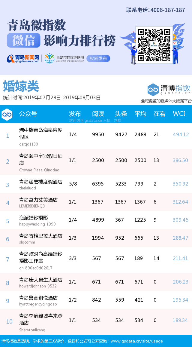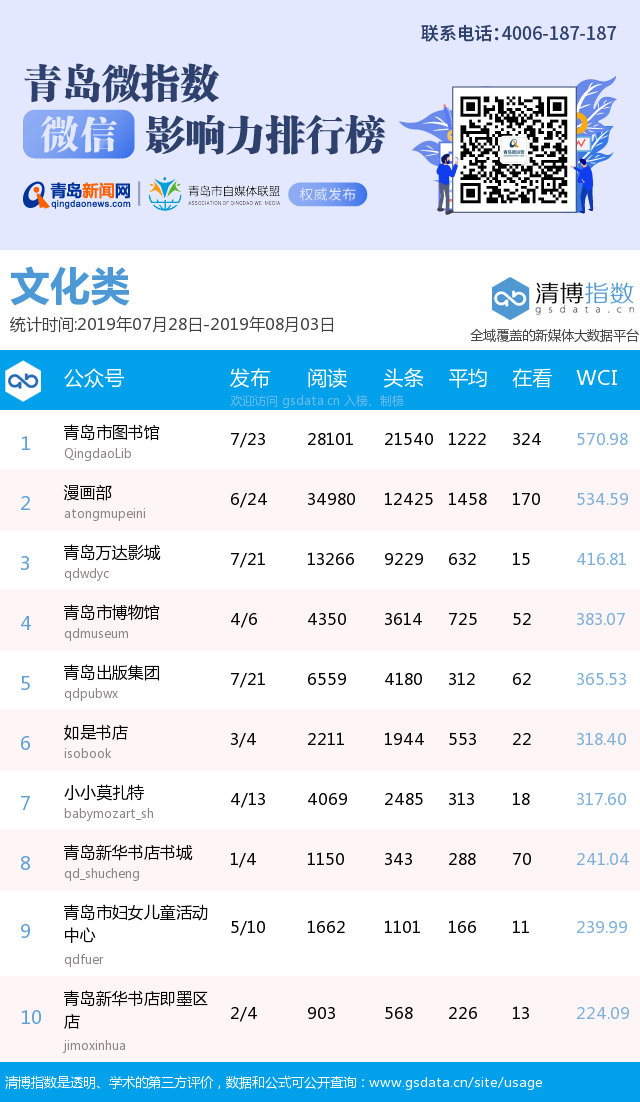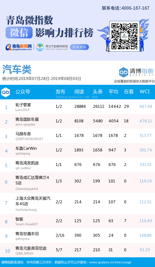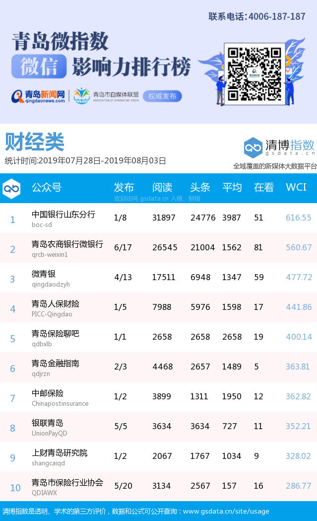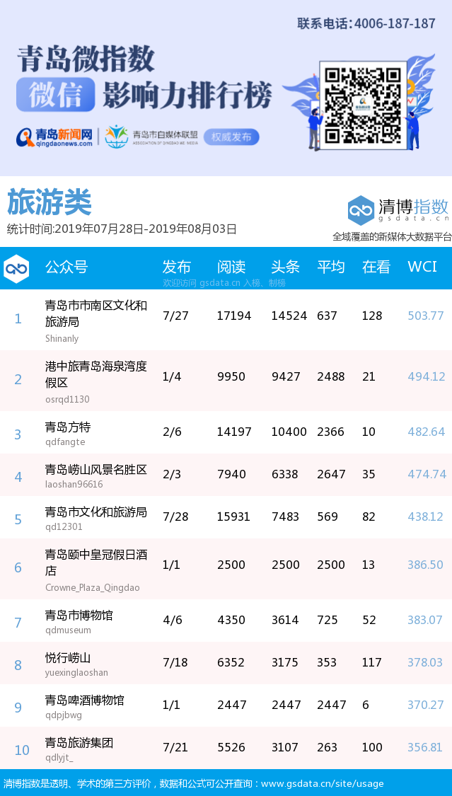 3、本次榜單收錄了青島14個行業(yè)微信公眾號,如您的賬號暫未收錄,可聯(lián)系4006-187-187。