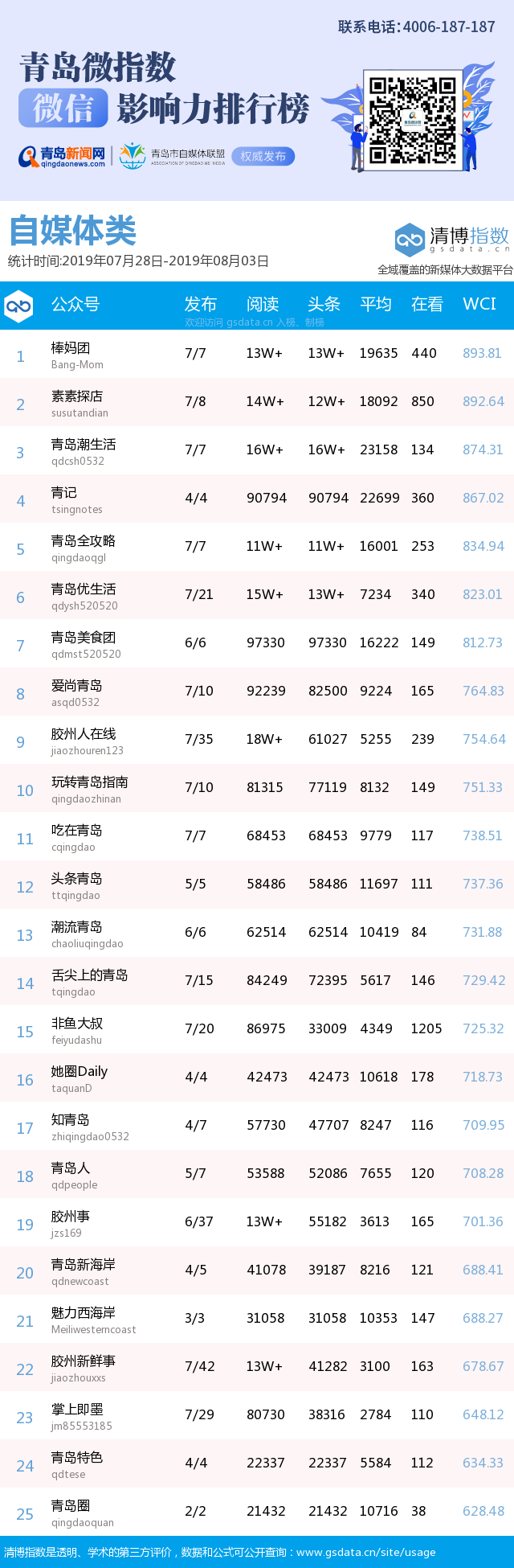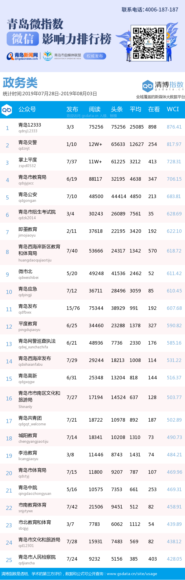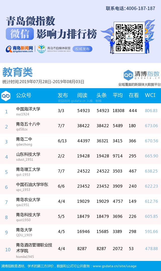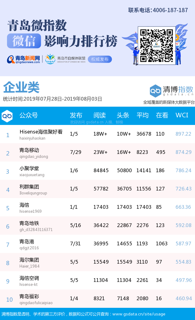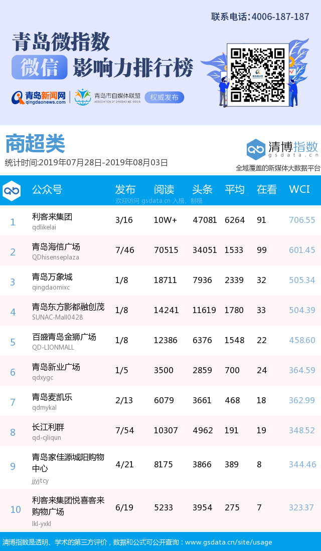 3、本次榜單收錄了青島14個行業(yè)微信公眾號,如您的賬號暫未收錄,可聯(lián)系4006-187-187。