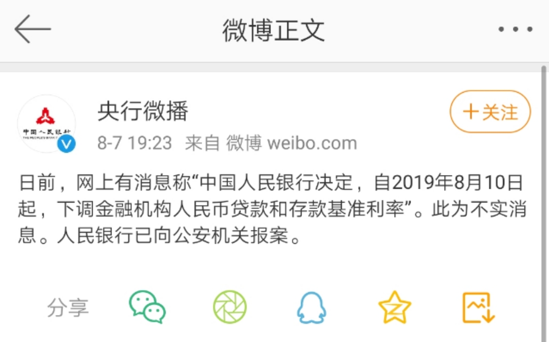 青島新聞網(wǎng)8月8日訊(見習記者丁淑華)8月7日,網(wǎng)絡(luò)上有消息稱,中國人民銀行決定自2019年8月10日起降息0.25個百分點。對此,中國人民銀行官微和官博回復(fù)稱,此為假消息。人民銀行已向公安機關(guān)報案。