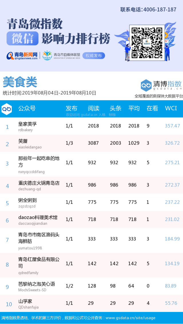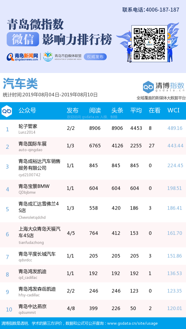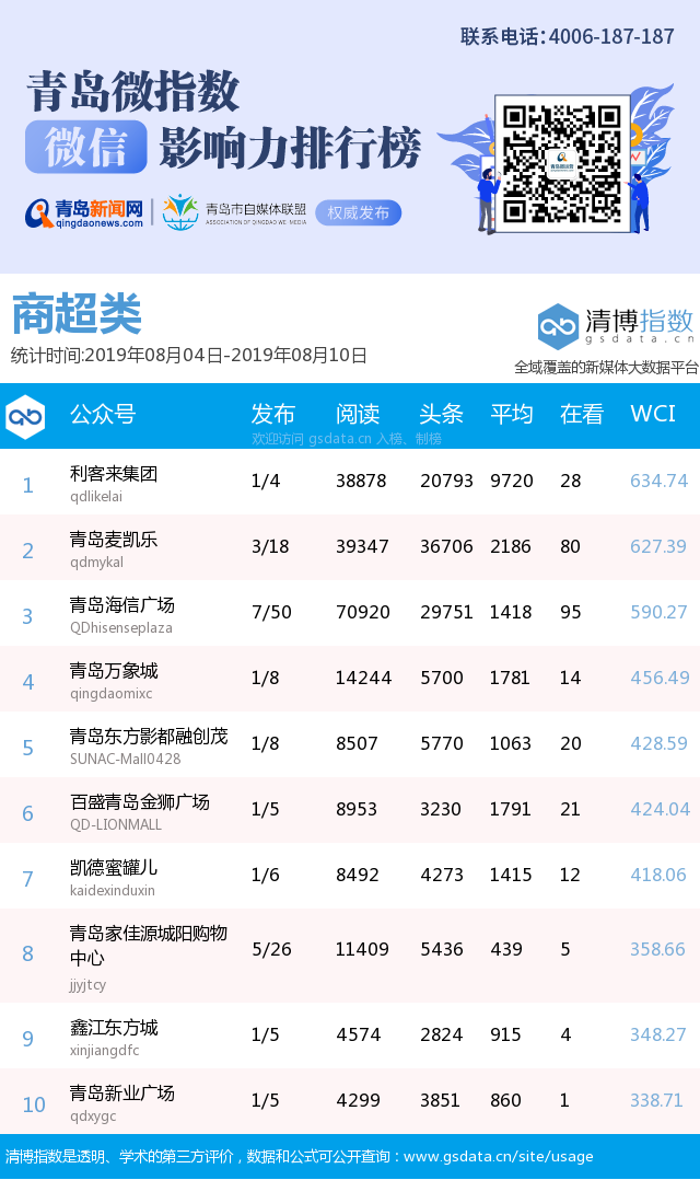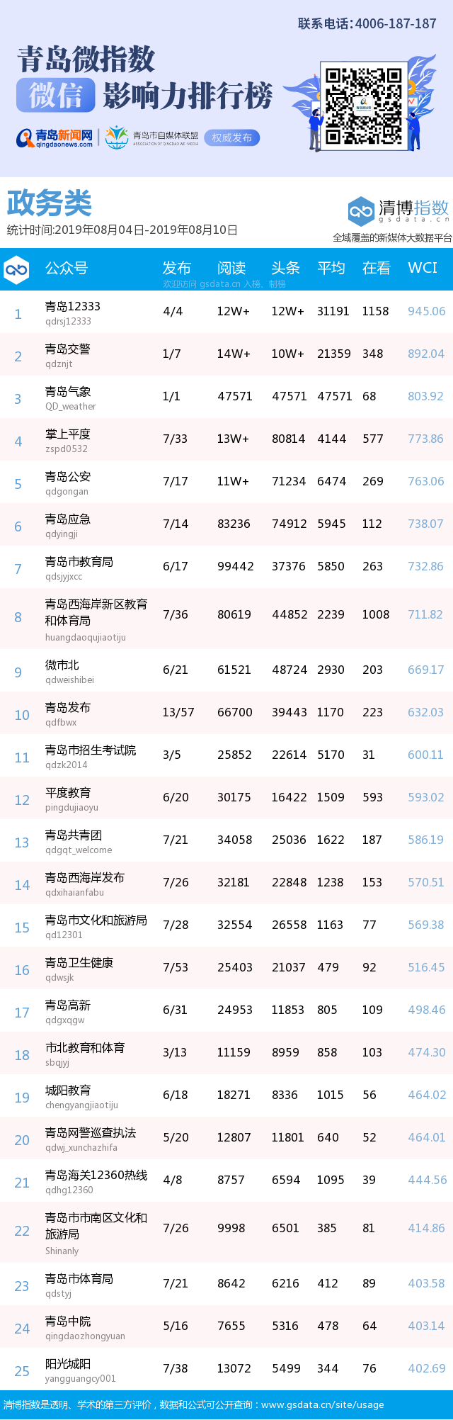 3、本次榜單收錄了青島14個行業(yè)微信公眾號,如您的賬號暫未收錄,可聯(lián)系4006-187-187。