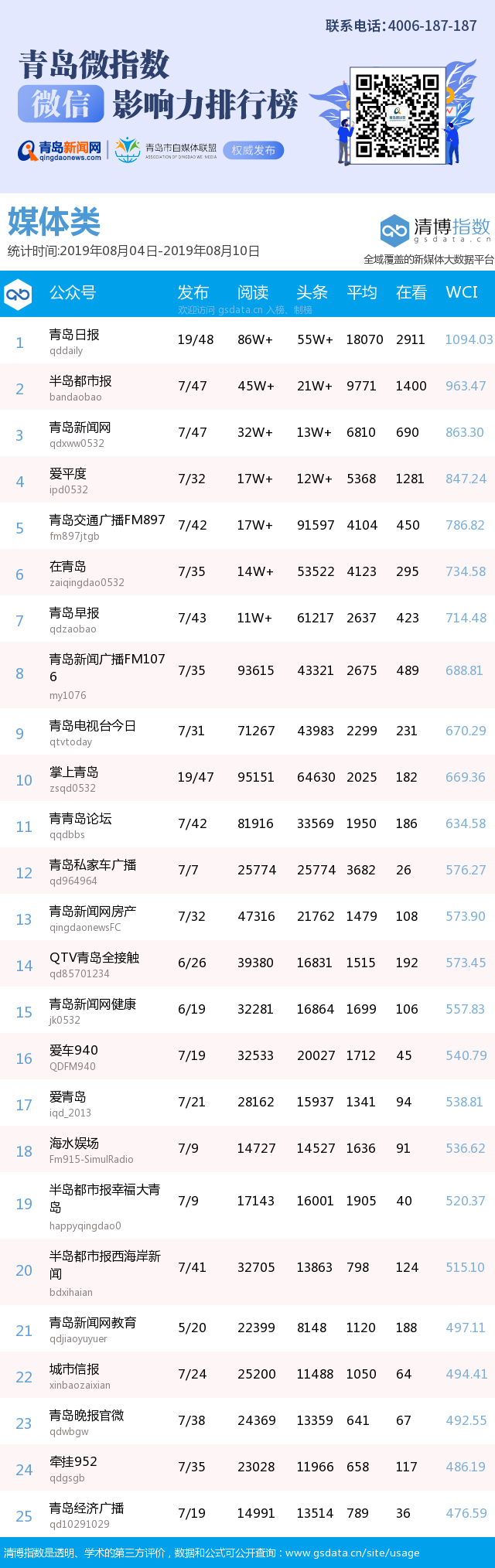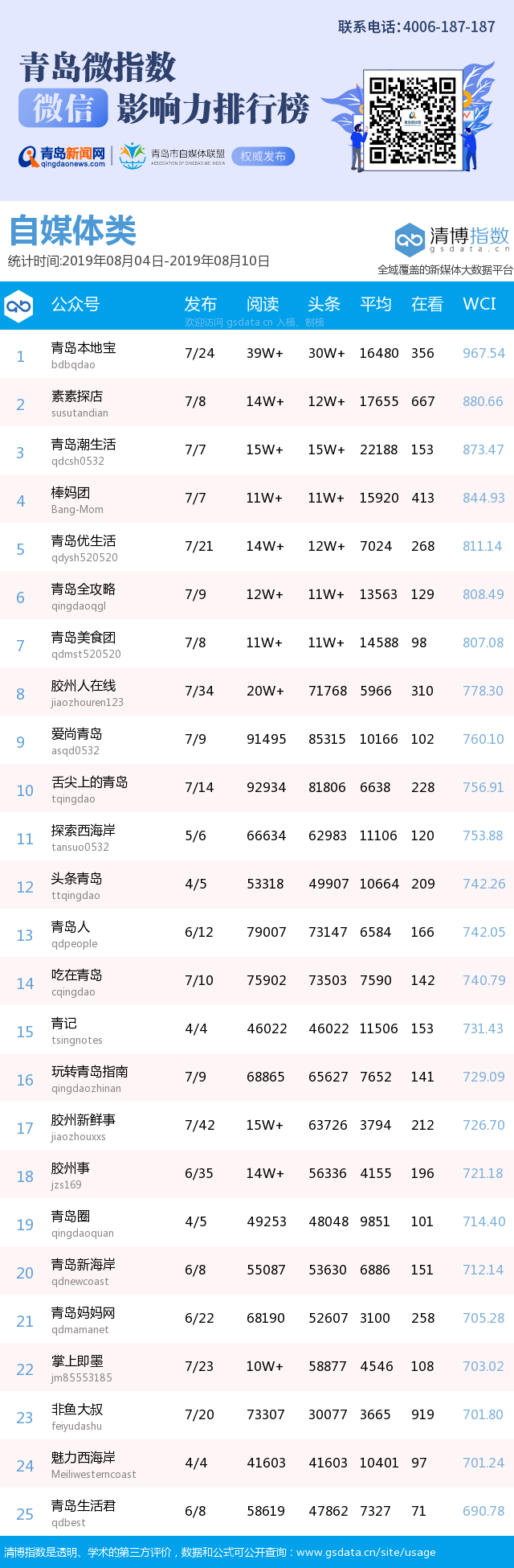 青島新聞網(wǎng)8月12日訊(記者 邢書玲)由青島新聞網(wǎng)、清博指數(shù)平臺聯(lián)手打造的“青島微指數(shù)微信影響力排行榜”今日發(fā)布一周(8月4日-8月10日)榜單。
