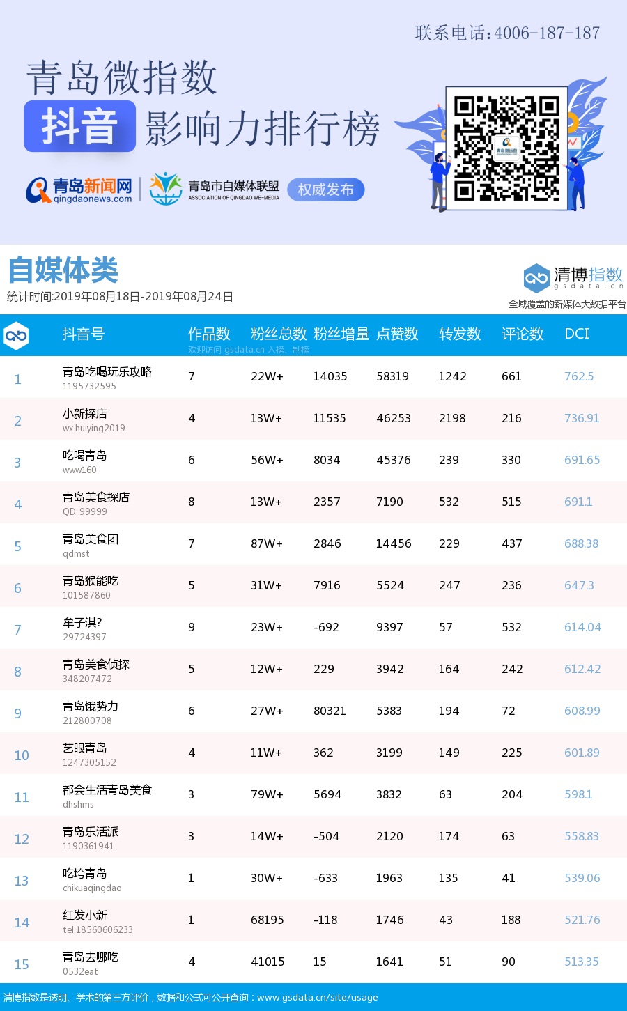 青島新聞網(wǎng)8月27日訊(記者 邢書玲)由青島新聞網(wǎng)、清博指數(shù)平臺聯(lián)手打造的“青島微指數(shù)抖音影響力排行榜”今日發(fā)布一周(8月18日-8月24日)榜單。