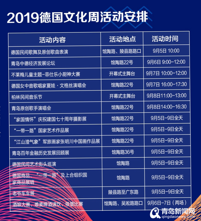 為讓廣大市民和中外游客充分了解國(guó)家發(fā)展的輝煌成就和青島發(fā)展進(jìn)步的歷史變遷,本屆“德國(guó)文化周”將舉辦“家國(guó)情懷-建國(guó)七十周年”攝影展、“百年金融回顧”展、“百年老爺車”展覽、“一帶一路”國(guó)家藝術(shù)展及著名軍旅畫家張明川中國(guó)畫作品展等形式多樣的藝術(shù)展覽活動(dòng)。