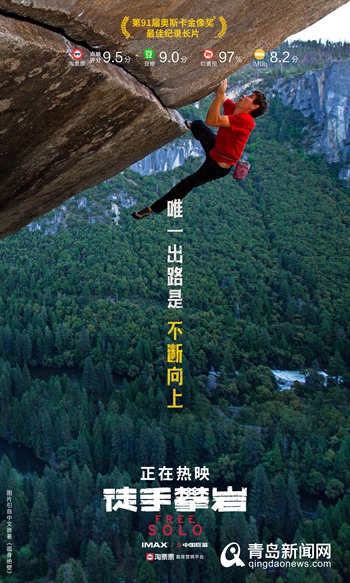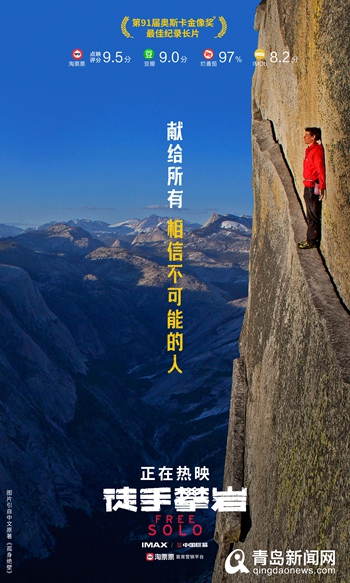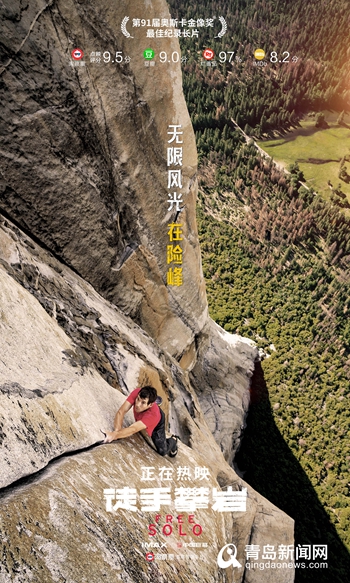 青島新聞網(wǎng)9月6日訊(記者 張力偉) 第91屆奧斯卡金像獎(jiǎng)獲獎(jiǎng)佳作《徒手攀巖》今日震撼上映,此前影片未映口碑先火,以其獨(dú)特的題材和超強(qiáng)的視覺體驗(yàn)獲得了觀眾的一致好評(píng),淘票票點(diǎn)映開分9.5分,豆瓣超五萬人打出9.0高分,?!锻绞峙蕩r》完整記錄了“世界徒手攀巖大師”亞歷克斯·霍諾德采用無保護(hù)、單人徒手(Free Solo)的方式,登頂美國約塞米蒂國家公園高達(dá)3000英尺的酋長巖的完整歷程,這是人類歷史上首次以毫無保護(hù)的方式登頂酋長巖。亞歷克斯對(duì)熱愛之事的極致追求和孤膽向上的勇士精神震撼感染了每一位觀眾,也讓影片成為2019年最受期待的影片之一。