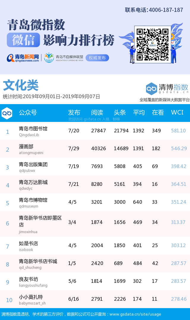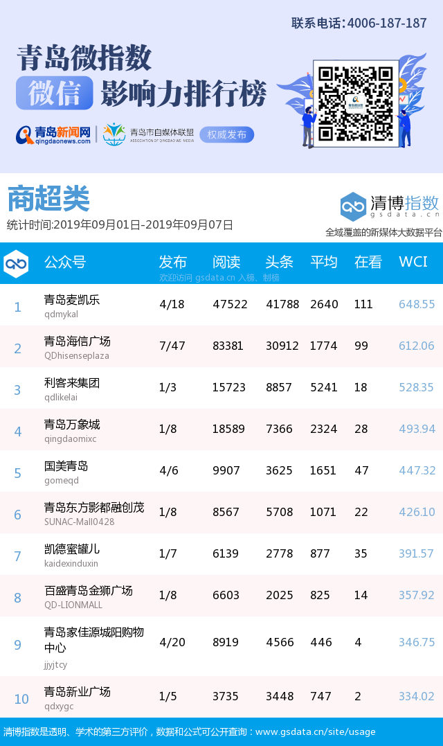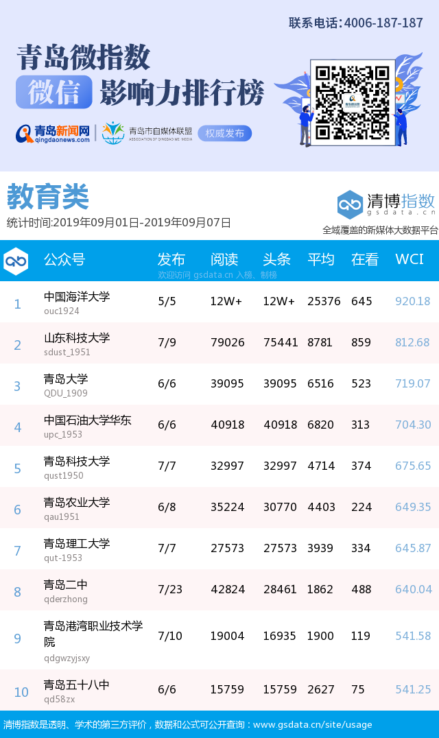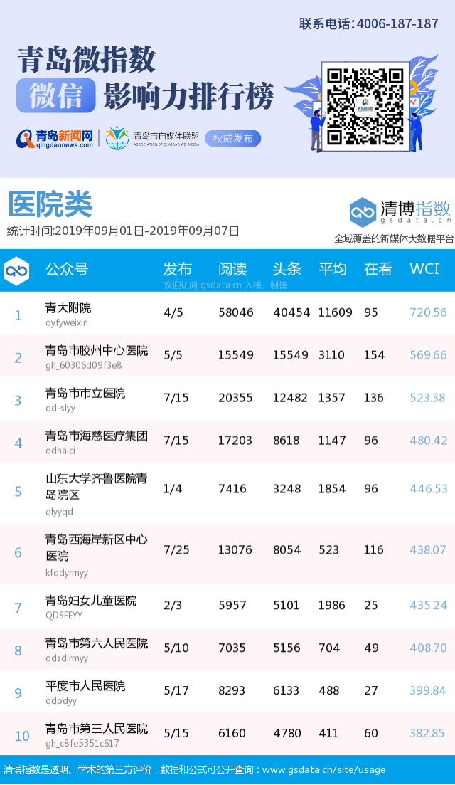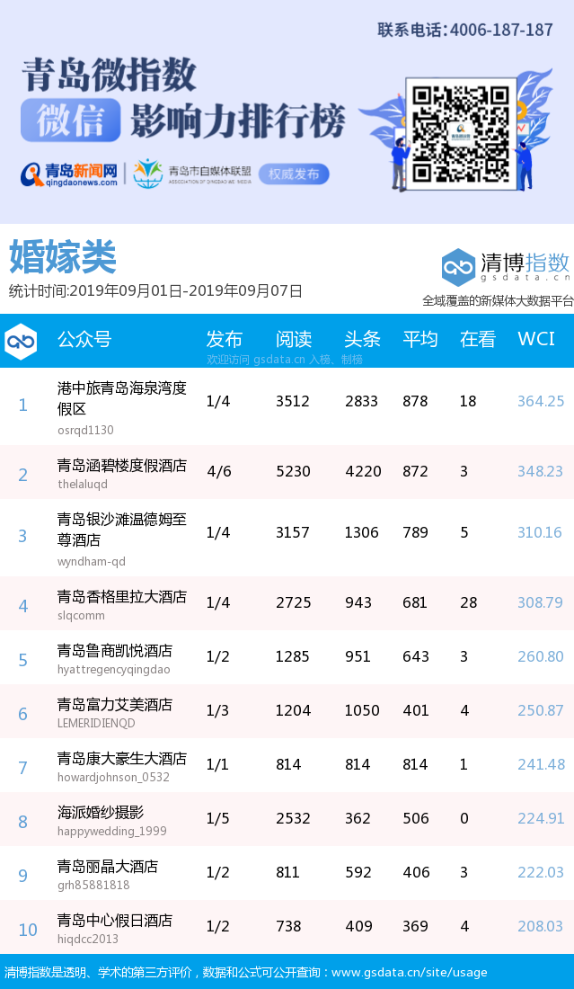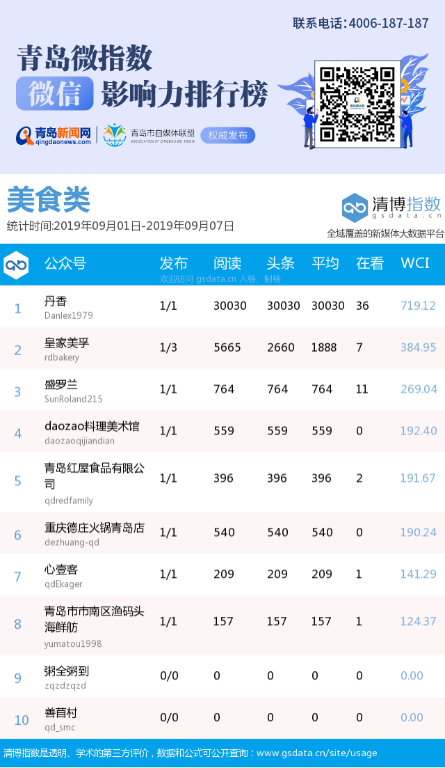3、本次榜單收錄了青島14個行業(yè)微信公眾號,如您的賬號暫未收錄,可聯(lián)系4006-187-187。