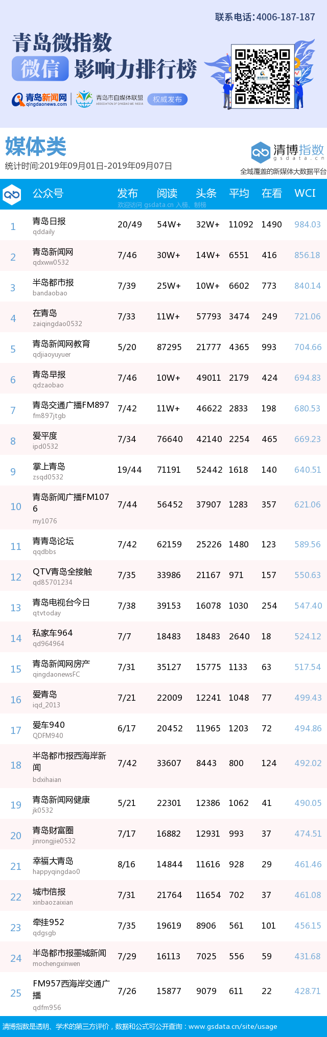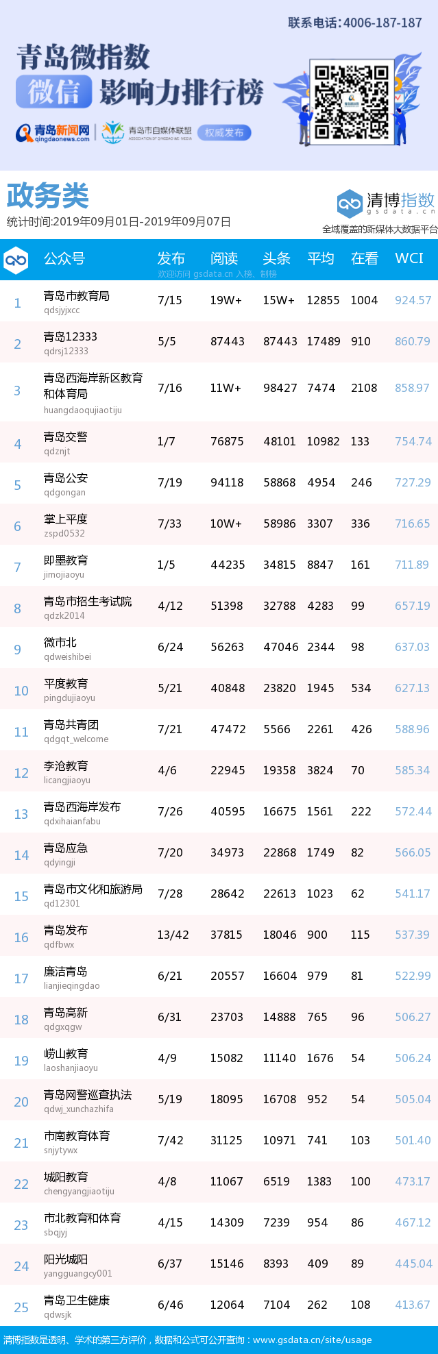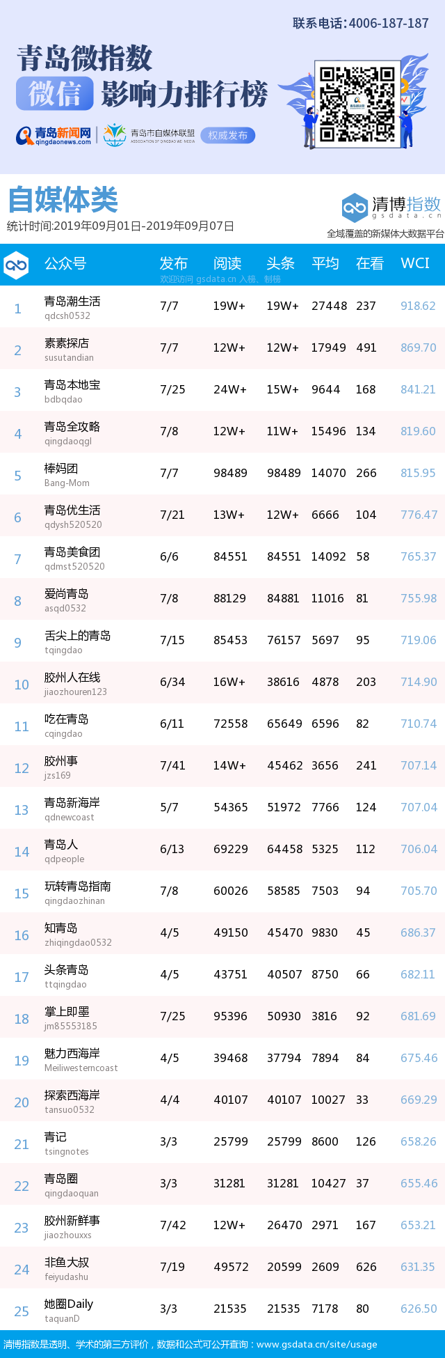 3、本次榜單收錄了青島14個行業(yè)微信公眾號,如您的賬號暫未收錄,可聯(lián)系4006-187-187。