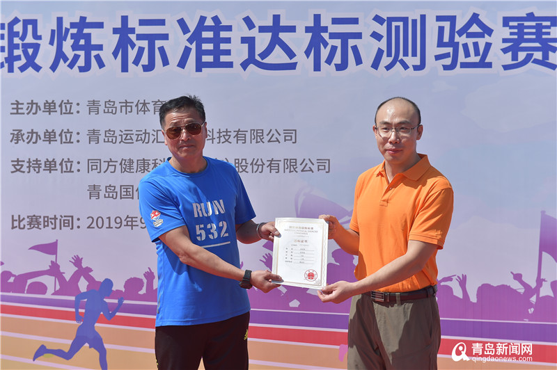 國家體育總局群體司鍛煉標(biāo)準(zhǔn)處處長宋云飛(右)為獲得青島市首張國家體育鍛煉標(biāo)準(zhǔn)達標(biāo)證書的選手頒發(fā)證書。