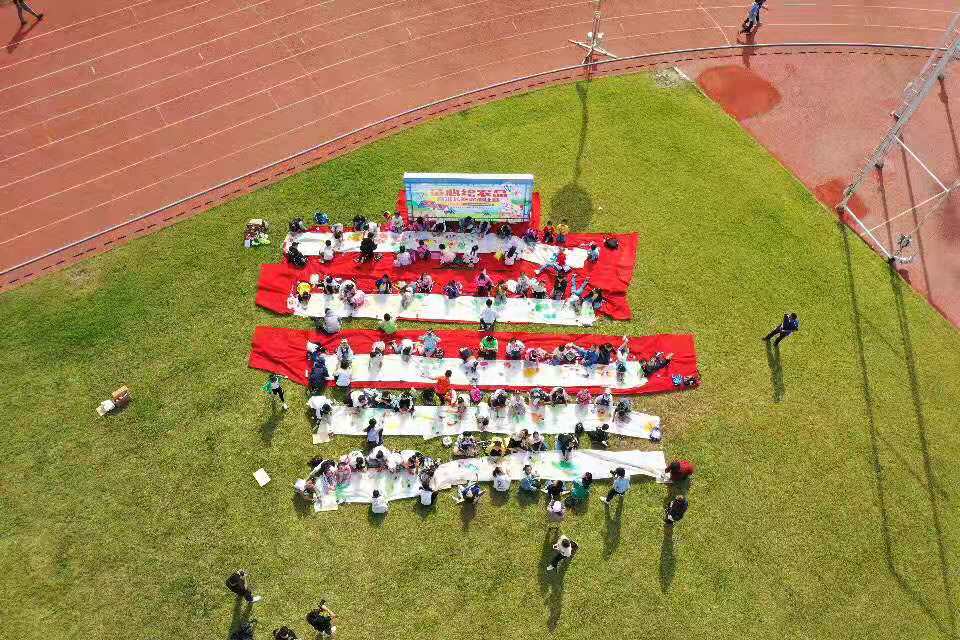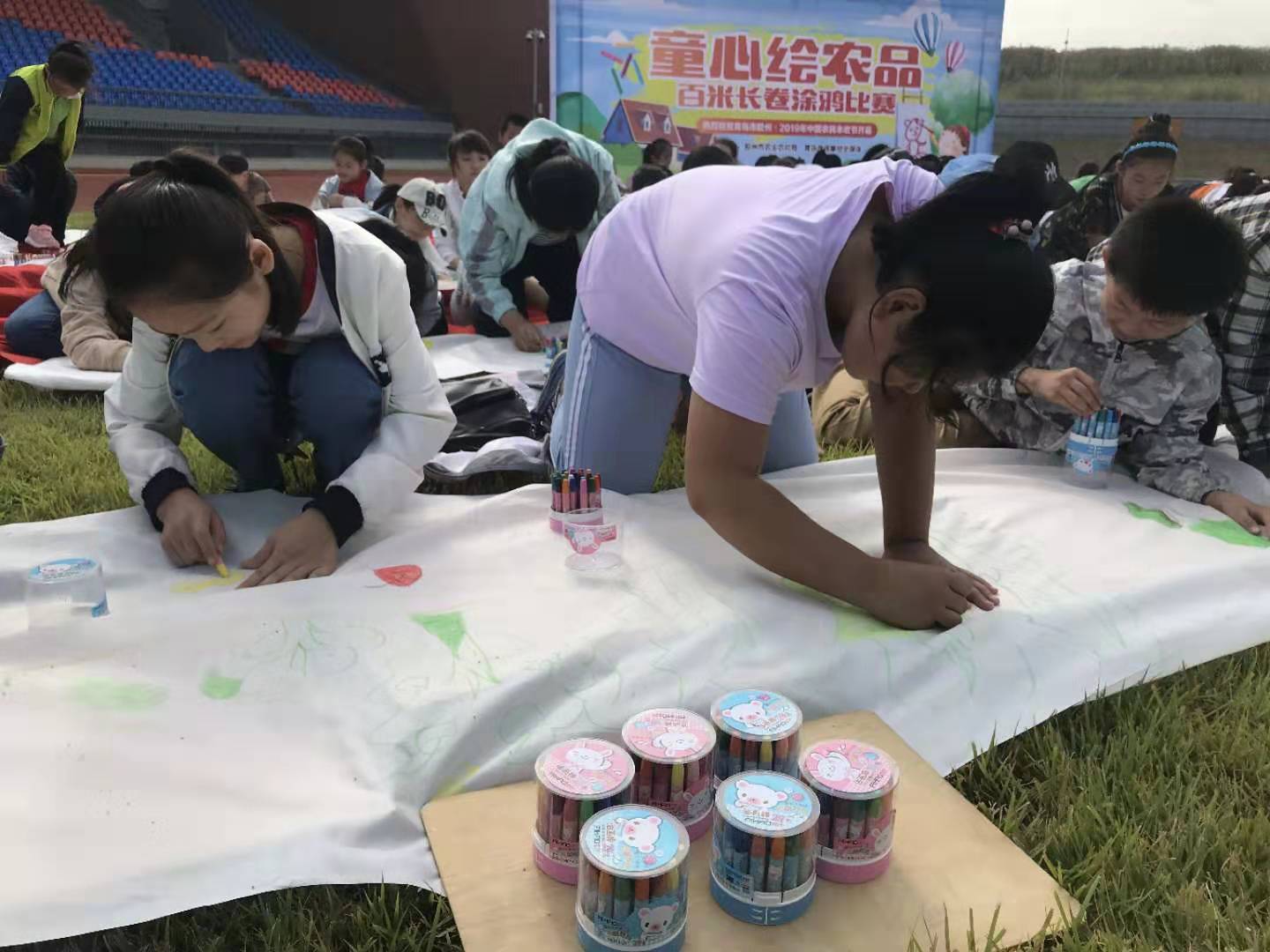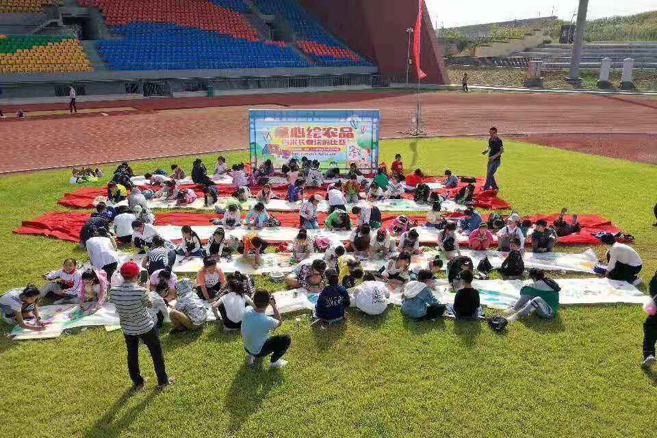 上午8:30,參加本次“童心繪”涂鴉大賽的選手們?cè)谀z州市體育中心大操場(chǎng)南側(cè)集合,在擺放的五條百米長(zhǎng)卷上,按順序依次排列站好位置。來(lái)源:青島晚報(bào)/掌上青島/青網(wǎng)