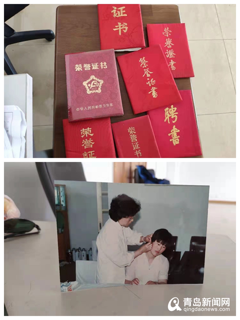 崔玉珍獲得的證書(左)、崔玉珍為患者診治(右)