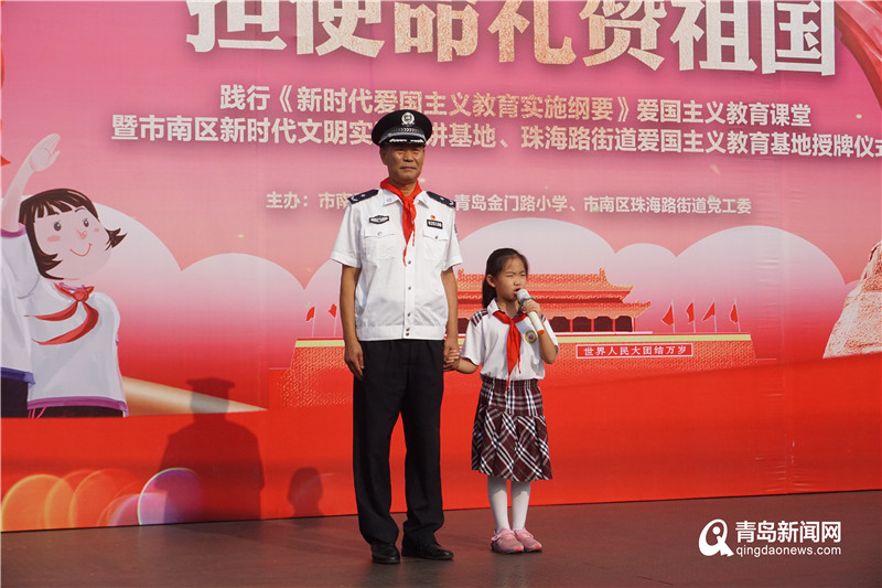 一位位學(xué)生代表拉著自己的“英雄”的手,依次來到臺(tái)上,有創(chuàng)作了百余首國(guó)學(xué)歌曲弘揚(yáng)愛國(guó)主義精神的全國(guó)老有所為先進(jìn)典型、國(guó)家一級(jí)作曲智樹春老師,有守護(hù)社區(qū)居民和師生安全的社區(qū)民警、全國(guó)公安機(jī)關(guān)愛民模范、全國(guó)優(yōu)秀人民警察、山東省“我最喜愛的十佳人民警察”陳呈章警官,有孩子心中的英雄、寧做蠟燭燃燒自己照亮學(xué)生的老師代表、火場(chǎng)逆行的英雄消防員爸爸、律政先鋒的律師媽媽、援助弱勢(shì)的社工師媽媽……在現(xiàn)場(chǎng),這些孩子們的“身邊的英雄”講述著做好愛國(guó)這件大事的“關(guān)鍵小事”和點(diǎn)滴細(xì)節(jié),給孩子們的愛國(guó)主義教育鋪就了心靈之路。而學(xué)生們也用自己的方式《致敬英雄》,向身邊的英雄表白,向身邊的英雄看齊。青島金門路小學(xué)校長(zhǎng)楊紅在國(guó)旗下,作出了開展好新時(shí)代愛國(guó)主義教育和紅色宣講的莊嚴(yán)承諾,向全體師生發(fā)出倡議,從點(diǎn)滴做起,讓愛國(guó)的種子深深在每一位學(xué)子的心中扎根,讓文明之花和愛國(guó)主義之花在街區(qū)綻放,向中華人民共和國(guó)成立70周年獻(xiàn)禮。