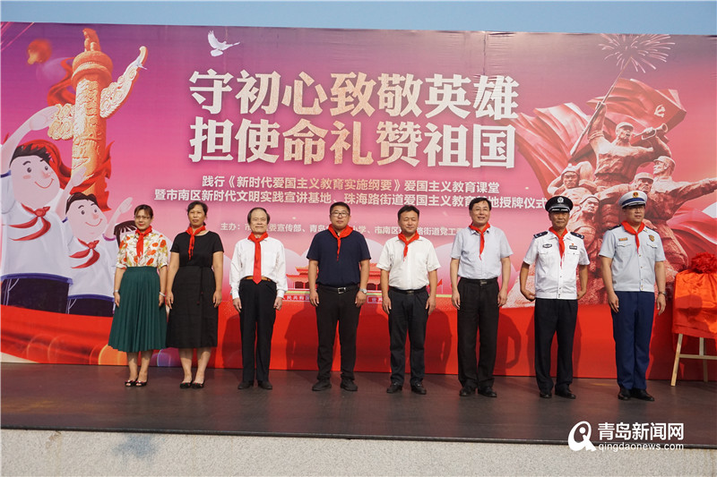 活動(dòng)現(xiàn)場(chǎng),佩戴著“烈士們鮮血染成的紅領(lǐng)巾”,市南區(qū)委宣傳部常務(wù)副部長(zhǎng)、網(wǎng)信辦主任孔兆鋒與市南區(qū)教育和體育局督學(xué)孫方凱共同為“市南區(qū)新時(shí)代文明實(shí)踐宣講基地”授牌,珠海路街道黨工委副書記、辦事處主任盛鵬與青島金門路小學(xué)校長(zhǎng)楊紅共同為“新時(shí)代愛國(guó)主義教育基地”授牌,珠海路街道有了全市第一個(gè)“新時(shí)代愛國(guó)主義教育基地”,“市南區(qū)新時(shí)代文明實(shí)踐宣講基地”再添學(xué)子力量。傳承紅色基因,我們有了學(xué)校陣地。