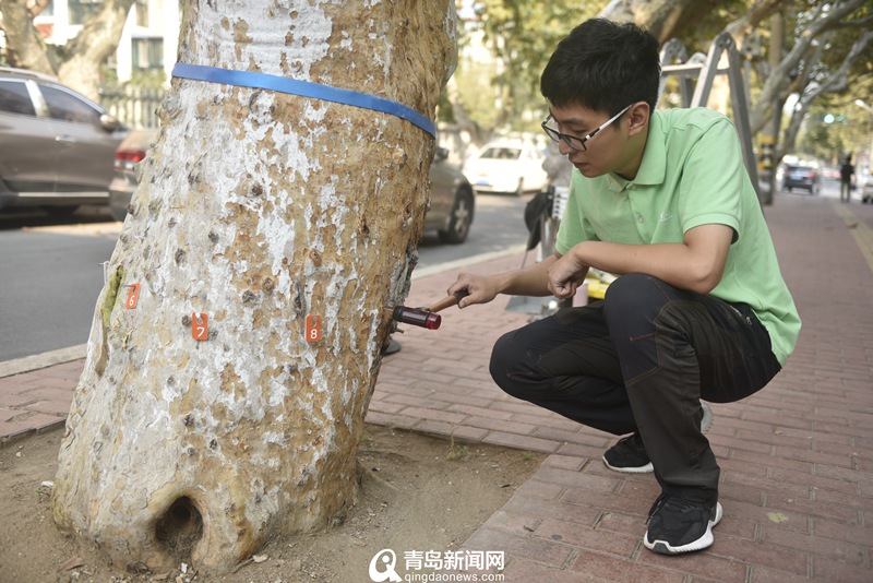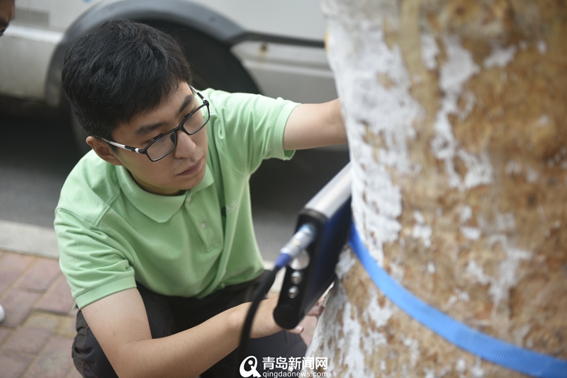 9月30日上午,市北區(qū)城市管理局四方園林服務(wù)中心在南豐路進行古樹維護作業(yè),現(xiàn)場工作人員告訴記者,這臺機器的價格將近20萬元,在以往的古樹修復(fù)工作中,由于缺乏專業(yè)的工具,很多古樹修復(fù)單位主要依靠錘子敲擊樹干來判斷樹干內(nèi)部生長狀況,此種方法既不專業(yè)也不能準確掌握古樹樹干的生長狀況,容易對樹木生長狀況產(chǎn)生誤判。為解決此問題,中心引進了這臺高科技設(shè)備。