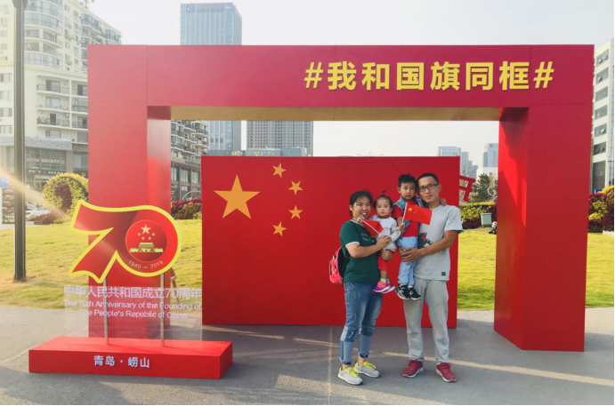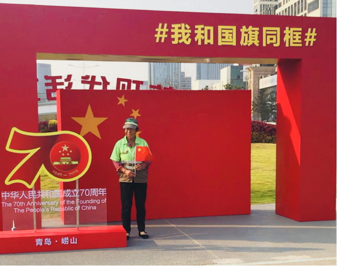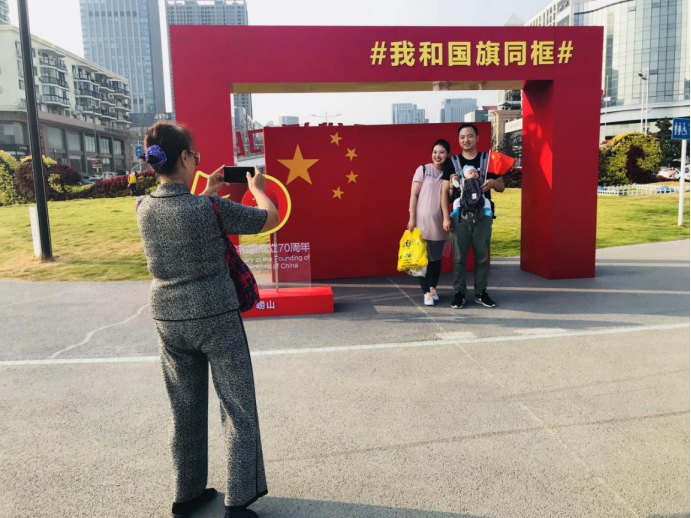 現(xiàn)場(chǎng),大家自發(fā)有序地來(lái)到合影墻前,拿出最美的迷人微笑與國(guó)旗同框。拍照行人中中既有白發(fā)蒼蒼的耄耋老人,也有青春可愛(ài)的孩童、少年;既有甜蜜出游的熱戀情侶,也有溫馨有愛(ài)的三口之家;既有辛勤的環(huán)衛(wèi)工人,也有愛(ài)美的島城大姨。大家擺POSE,舉國(guó)旗,喊口號(hào),綻笑容,以自己獨(dú)特的同框方式表白祖國(guó),獻(xiàn)上內(nèi)心的一片赤誠(chéng)與真摯祝福。