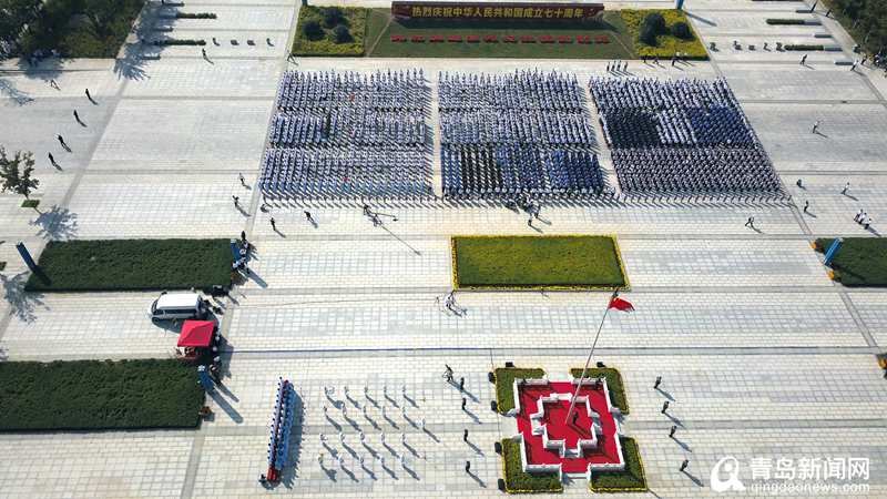 即墨區(qū)慶祝新中國成立70周年升旗儀式現(xiàn)場航拍圖。(周進(jìn)業(yè) 攝)