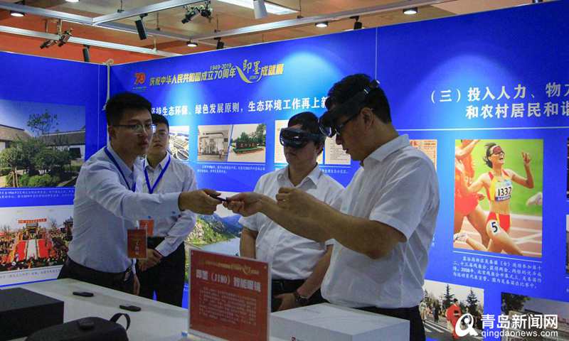 “中華人民共和國成立70周年即墨成就展”上,觀眾體驗(yàn)“JIMO”混合現(xiàn)實(shí)眼鏡。