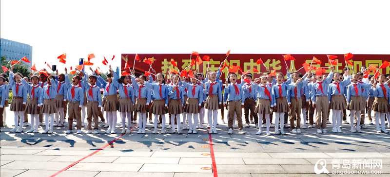 即墨區(qū)慶祝新中國成立70周年升旗儀式上,小學(xué)生們舞動(dòng)國旗興奮不已。(周進(jìn)業(yè) 攝)