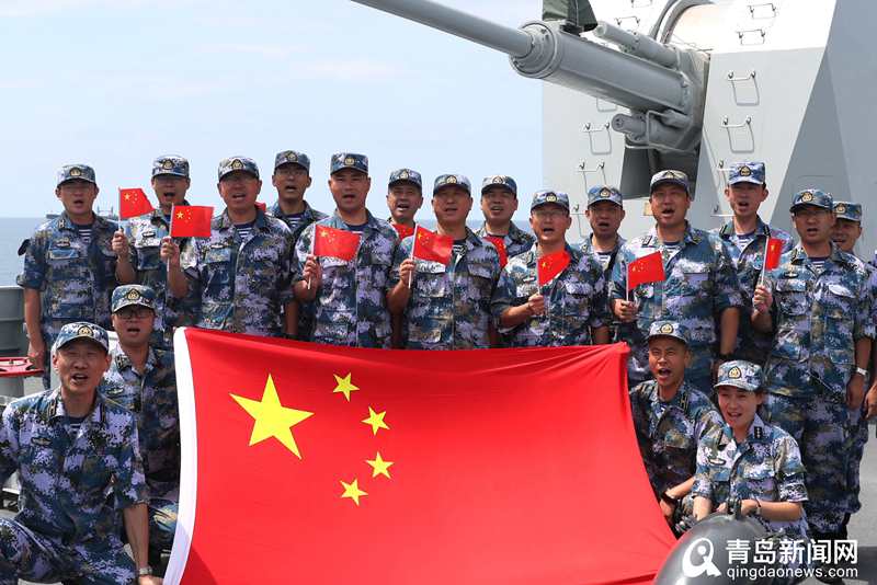 官兵們手舉國旗祝福祖國 。