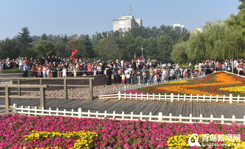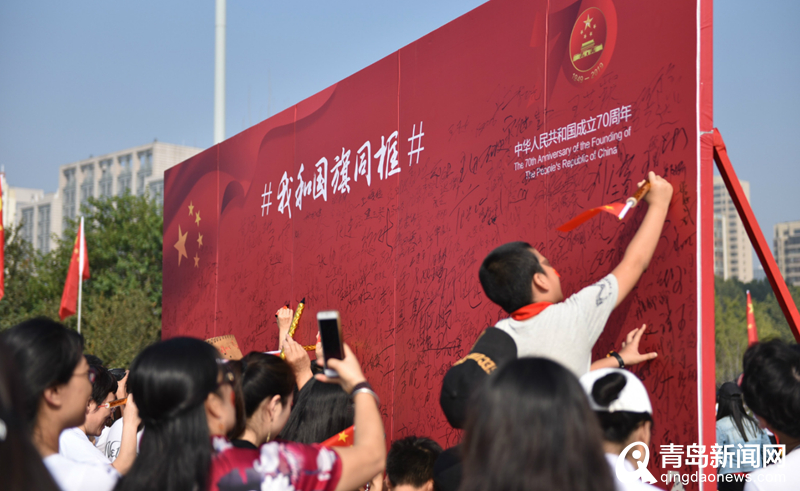 升國旗儀式后,膠州市干部群眾一同前往“我和國旗同框”處簽名、合影留念。