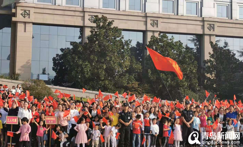 上午7時,參加升國旗儀式的人們早早來到膠州市級機關(guān)辦公大樓前廣場,他們紛紛手持國旗,翹首盼望。