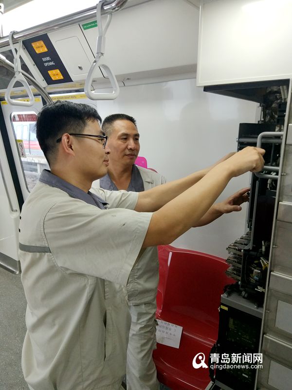 劉萬(wàn)友(右一)在車廂進(jìn)行安全檢測(cè)工作。