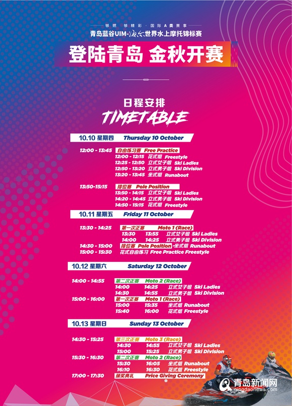 青島新聞網(wǎng)10月7日訊(記者 劉倩倩)家門口就能看水上版的“速度與激情”,約不約?踏準(zhǔn)青島“開放、現(xiàn)代、活力、時尚”的節(jié)拍,10月10日至13日,國際A類賽事——青島藍谷UIM—海爾世界水上摩托錦標(biāo)賽,將在青島市即墨區(qū)藍谷濱海公園燃情開賽。來自世界各地的頂級選手將齊聚青島,展開激烈角逐,上演一場不容錯過的水上盛宴。