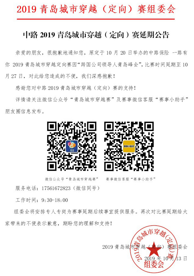 青島新聞網(wǎng)10月13日訊(記者 黃曉)受峰會(huì)影響,原定于10月20日舉辦的“中路保險(xiǎn) 一路有你”2019青島城市穿越(定向)賽將延期至10月27日上午舉行。已報(bào)名的參賽者如有問(wèn)題可咨詢賽事微信客服“賽事小助手”,組委會(huì)將安排專人專崗為賽事延期后續(xù)事宜提供服務(wù)。