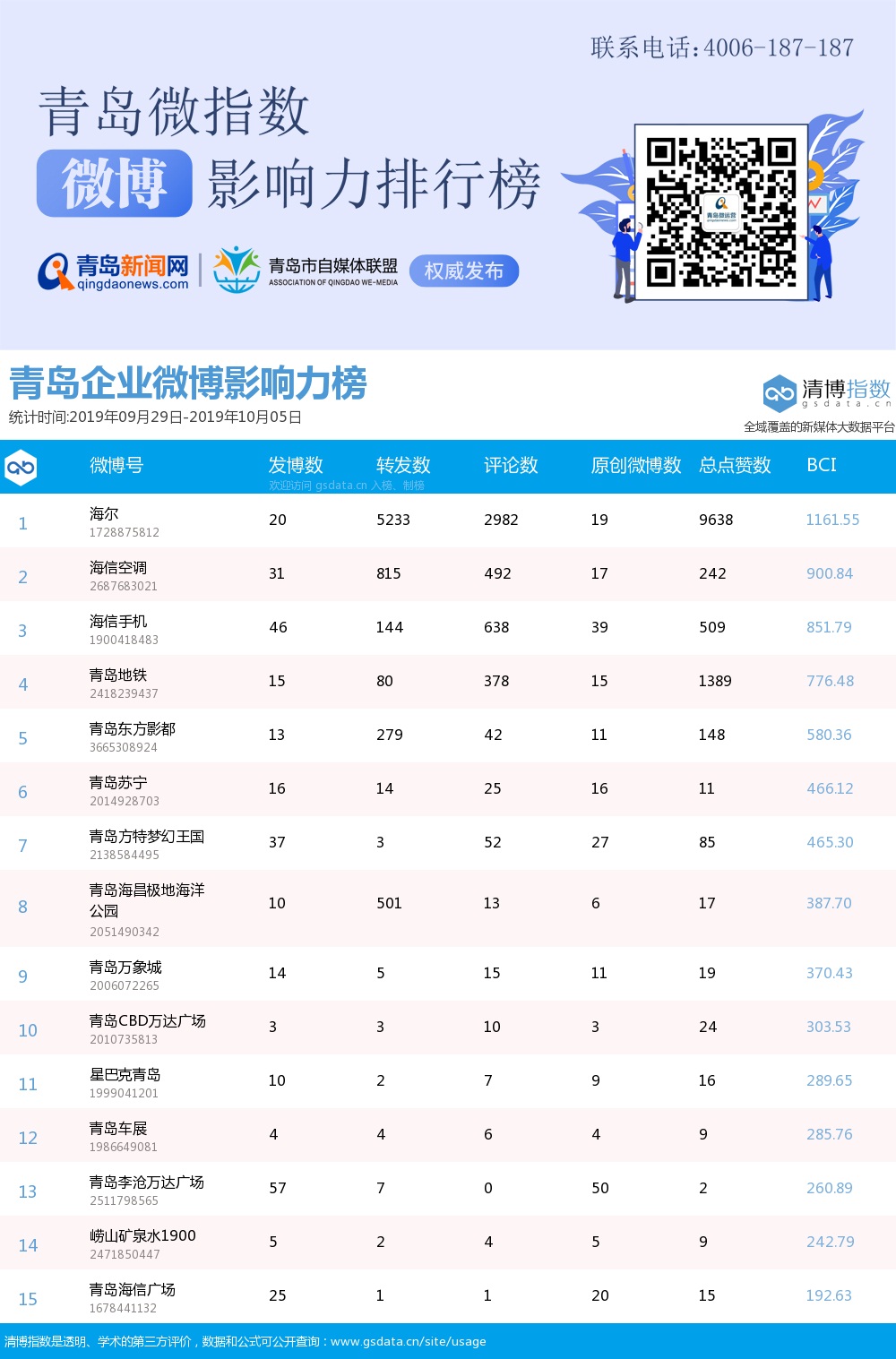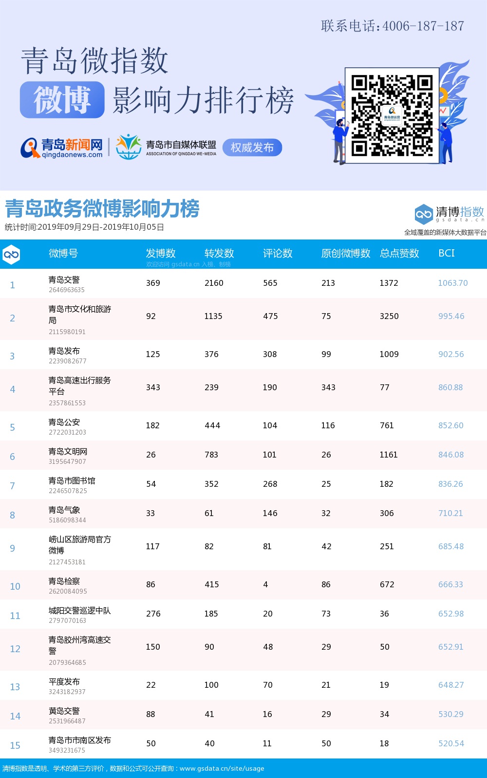 青島新聞網(wǎng)10月15日訊(記者 邢書玲)由青島新聞網(wǎng)、清博指數(shù)平臺聯(lián)手打造的“青島微指數(shù)微博影響力排行榜”今日發(fā)布一周(9月29日-10月5日)榜單。
