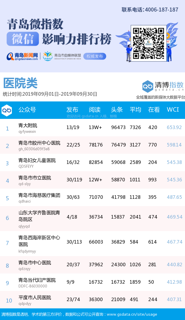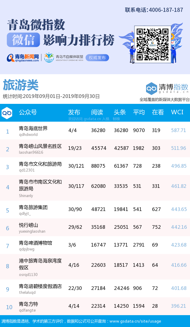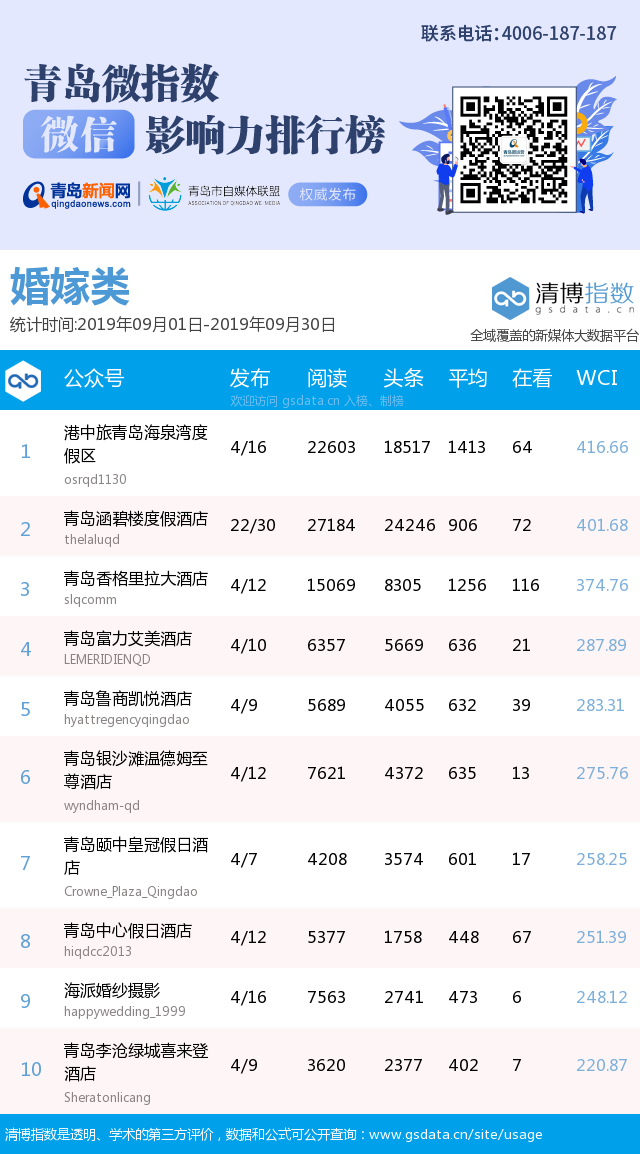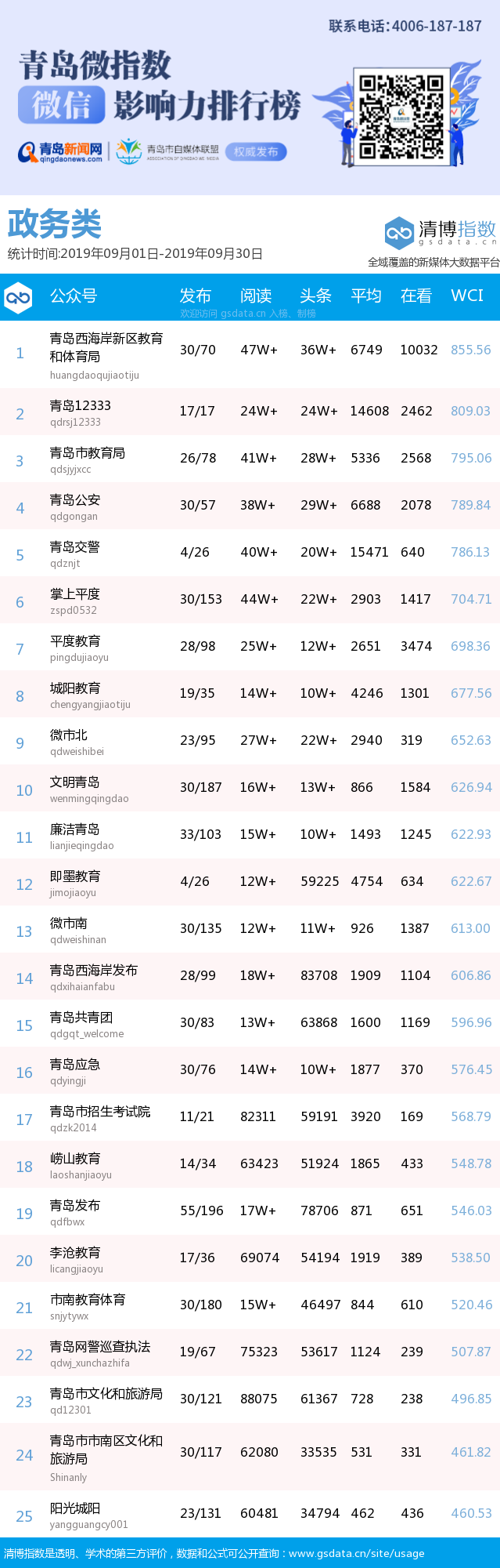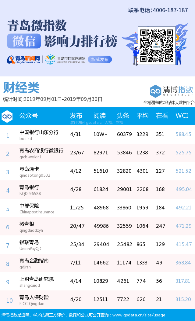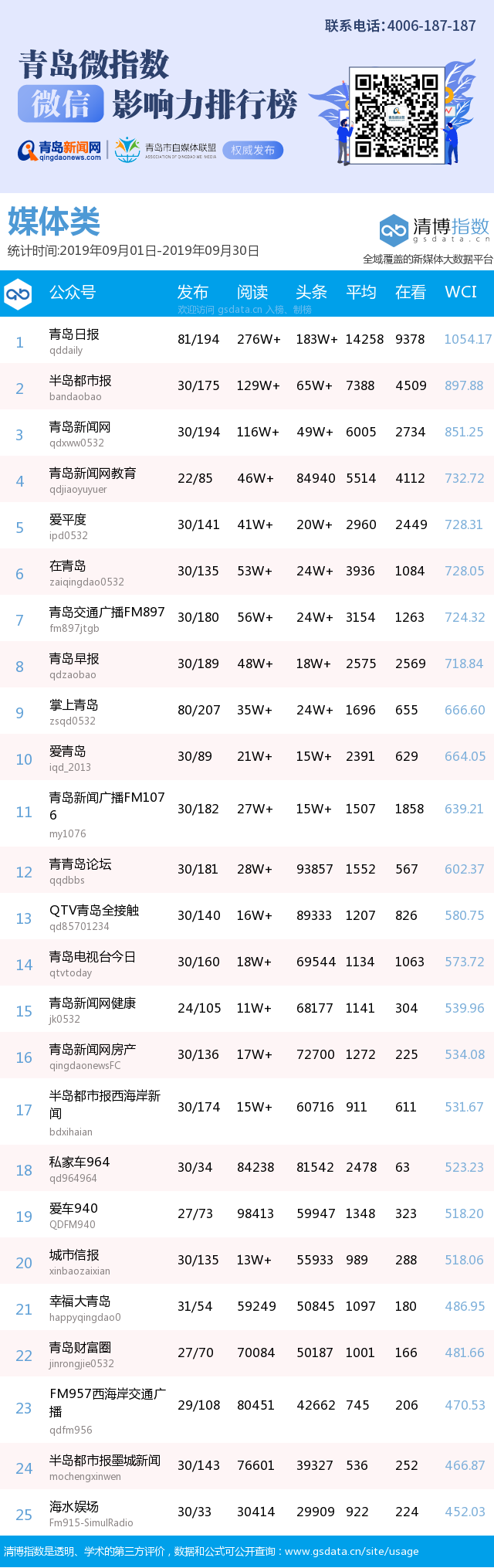 3、本次榜單收錄了青島14個行業(yè)微信公眾號,如您的賬號暫未收錄,可聯(lián)系4006-187-187。