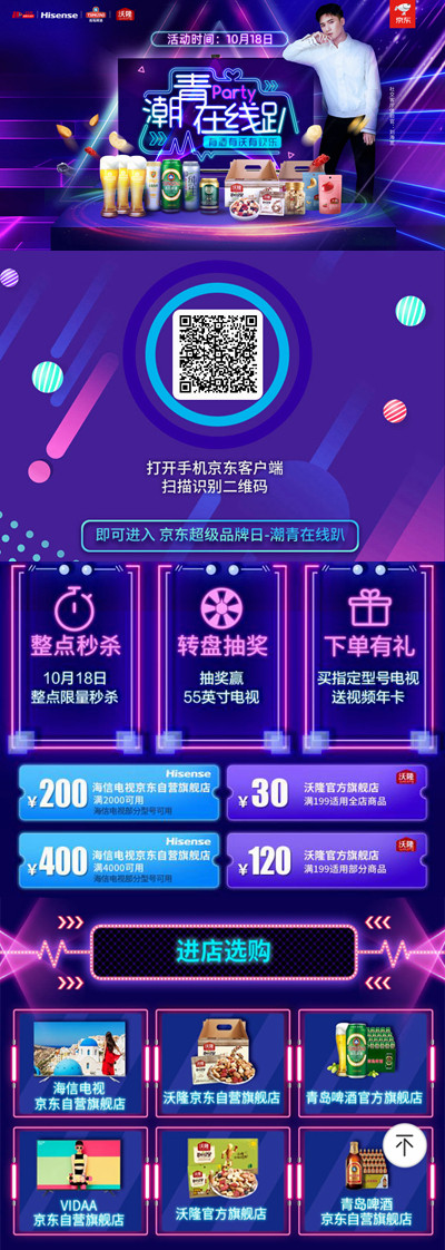 滿減優(yōu)惠、第二件半價、買二送一、整點秒殺、轉盤抽獎……10月18日,海信電視、青島啤酒、沃隆堅果三大品牌京東平臺6店聯(lián)動助力“潮青在線趴”,給力優(yōu)惠限時進行中!