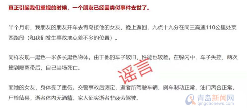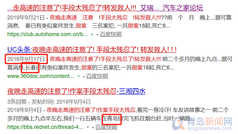 經(jīng)“山東高速交警”核實(shí),青島、煙臺(tái)高速交警近年來均未接到過有關(guān)投擲障礙物從而引發(fā)交通事故進(jìn)行搶劫類的警情,文中所提到的同三高速已于2007年改名為沈海高速,威烏高速也已于2007年改名為榮烏高速。2009年以來該虛假信息在互聯(lián)網(wǎng)多次傳播,為此“青島公安”在2012年10月2日,通過微博專門發(fā)布過辟謠信息。