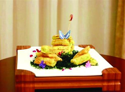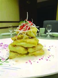 鍋塌是魯菜的一種傳統(tǒng)技法,由于制作稍顯麻煩,很多酒店不太愿意做。四流南路的柒號(hào)院飯店還秉承著老的傳統(tǒng)制作工藝。柒號(hào)院的廚師長(zhǎng)楊明翟介紹,白菜葉開(kāi)水稍燙,抹上蝦泥修成方形,拖蛋液入鍋內(nèi)煎成兩面金黃,加高湯小火燜至湯汁濃稠即可食用。