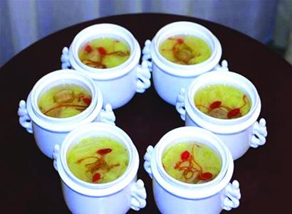 這道菜是青島的特色菜品,也是選用清澈的雞湯配上干的扇貝柱和白菜制作而成。為了菜品的營(yíng)養(yǎng)和感官,加了蟲(chóng)草花和枸杞。這些原材料在市場(chǎng)都很容易買到。膠州賓館的鮑魚(yú)房主管石樹(shù)家介紹,瑤柱用溫水泡半小時(shí),蟲(chóng)草花、枸杞洗凈。大白菜葉去幫撕成片。白菜葉焯水過(guò)涼攥干水,分入盅里。把泡好的瑤柱蟲(chóng)草花枸杞放在白菜上。清雞湯調(diào)好味加在盅里。放入籠屜蒸1小時(shí)即可。