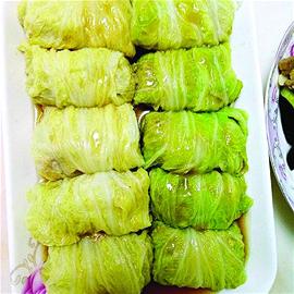 這道菜也是膠州、城陽(yáng)等地的百姓菜品。廚師出身的史勝?gòu)?qiáng)現(xiàn)在擔(dān)任鑫復(fù)盛餐飲公司服務(wù)中心總監(jiān),善于從百姓的菜品中尋找靈感。這道菜就是史勝?gòu)?qiáng)在膠州看到的,加以改進(jìn),增加了肉餡和海米,味道更濃郁。史勝?gòu)?qiáng)介紹,把膠州大白菜的菜幫和老葉剁餡加肉餡和泡好的海米調(diào)味,嫩葉部分上鍋蒸軟做皮。用白菜葉包裹白菜餡兒上籠蒸熟即可。