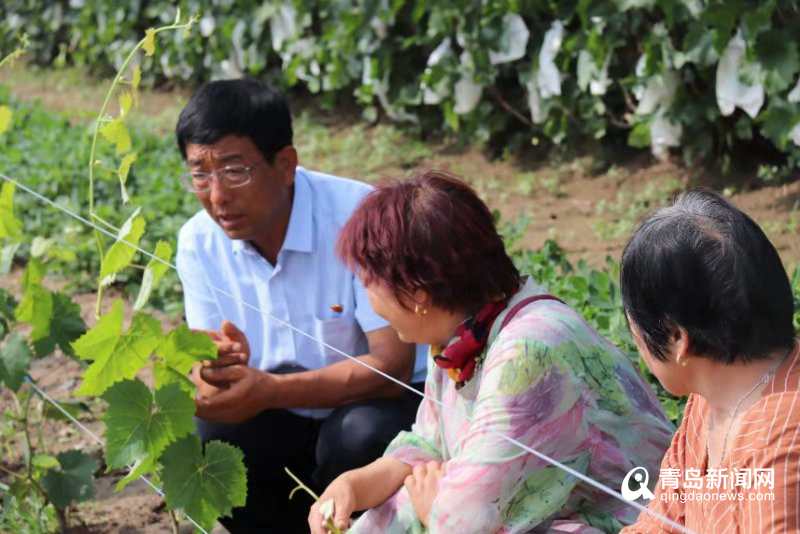萊西市日莊鎮(zhèn)溝東新村黨支部書記高維玉(左一)與村民一起查看葡萄長勢。
