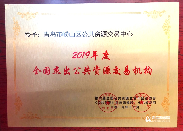 青島新聞網(wǎng)12月25日訊(記者 朱穎 通訊員 張緒霞)近日,在北京召開的2019年全國公共資源交易年會頒獎典禮上傳來喜訊,嶗山區(qū)公共資源交易中心從全國各地推薦的近300家機(jī)構(gòu)中脫穎而出,被評為“2019年度全國杰出公共資源交易機(jī)構(gòu)”。