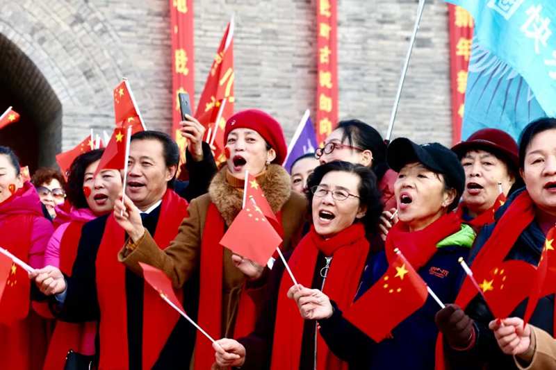 “我和我的祖國,一刻也不能分割,無論我走到哪里,都流出一首贊歌……”伴隨著《我和我的祖國》這熟悉旋律的響起,即墨婦聯(lián)“巾幗女神方隊(duì)”領(lǐng)唱,現(xiàn)場的參賽者、游客、工作人員的目光被聚攏,熱情被點(diǎn)燃,從五六歲的幼童到六七十歲的長者,大家揮舞著手中的小紅旗,千人放聲歌唱,迎接新年的到來,嘹亮的歌聲回蕩在即墨古城上空。