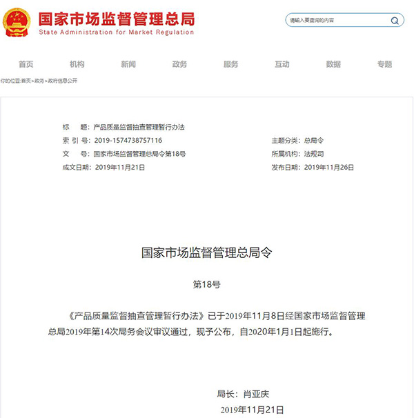2019年11月26日,國(guó)家市場(chǎng)監(jiān)督管理總局官網(wǎng)發(fā)布國(guó)家市場(chǎng)監(jiān)督管理總局令第18號(hào),公布了《產(chǎn)品質(zhì)量監(jiān)督抽查管理暫行辦法》,該《辦法》自2020年1月1日起施行。