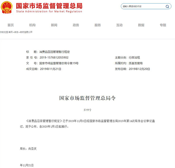 2019年11月8日,國(guó)家市場(chǎng)監(jiān)管總局審議通過了《消費(fèi)品召回管理暫行規(guī)定》,并于2019年12月20日在官網(wǎng)進(jìn)行了發(fā)布,《召回新規(guī)》于2020年1月1日起正式實(shí)施。