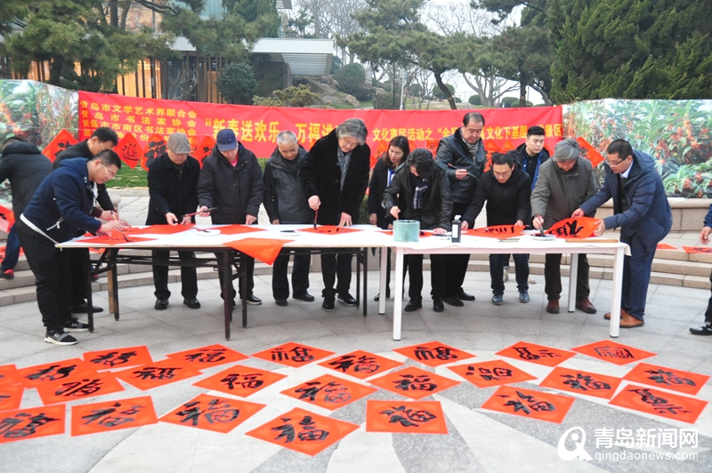 青島新聞網(wǎng)1月5日訊(記者 王超) 昨天,由青島市文學(xué)藝術(shù)界聯(lián)合會(huì)主辦,青島市書(shū)法家協(xié)會(huì)、青島市市南區(qū)書(shū)法家協(xié)會(huì)、德才裝飾股份有限公司承辦的“新春送歡樂(lè),萬(wàn)福進(jìn)萬(wàn)家”文藝惠民活走進(jìn)海濱景區(qū),在小青島景區(qū)為游客和工作人員送福祝福。