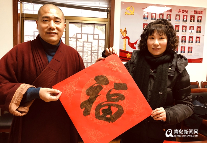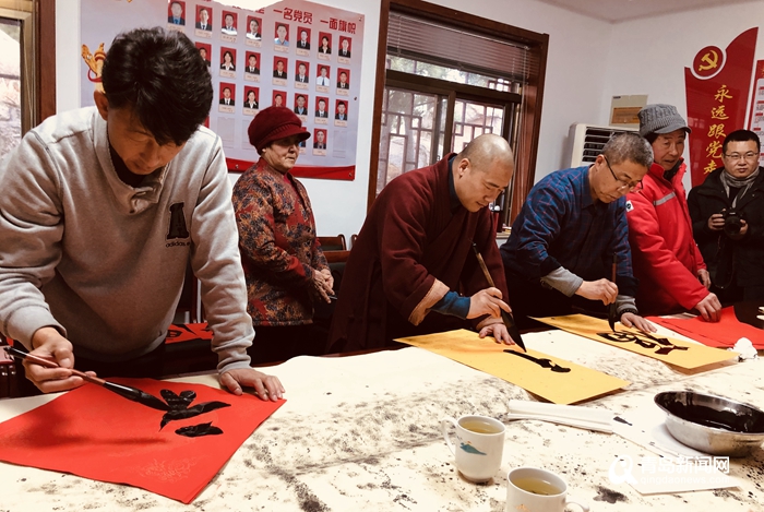活動(dòng)當(dāng)天,華嚴(yán)管理處擠滿了前來(lái)領(lǐng)“?!钡拇迕?。一個(gè)個(gè)新穎創(chuàng)意的福字,散發(fā)著淡雅的墨香。書(shū)法老師揮毫潑墨,或行云流水,或龍飛鳳舞,造型各異的“?!弊值莱隽舜迕駥?duì)美好生活的向往。