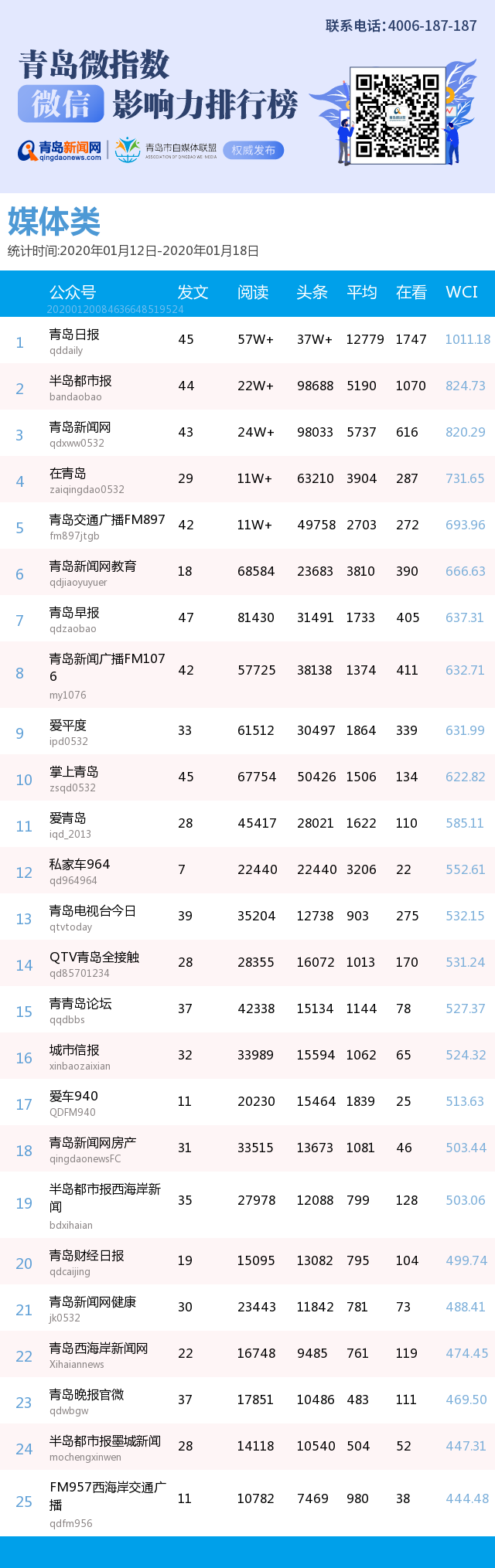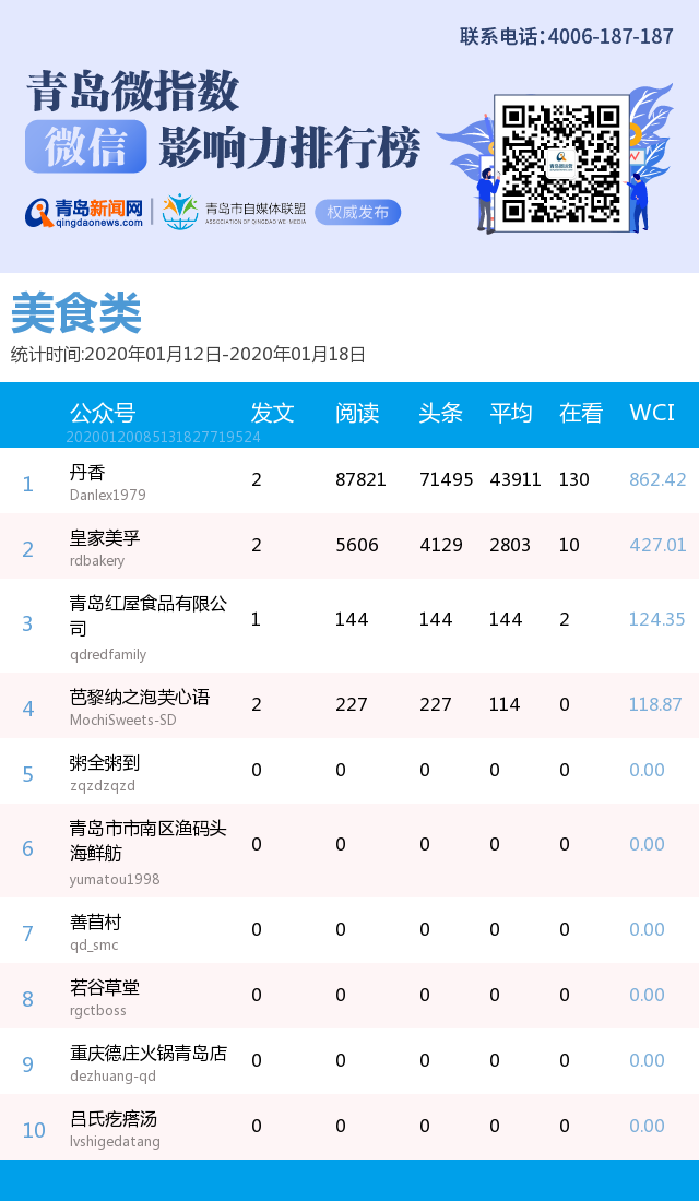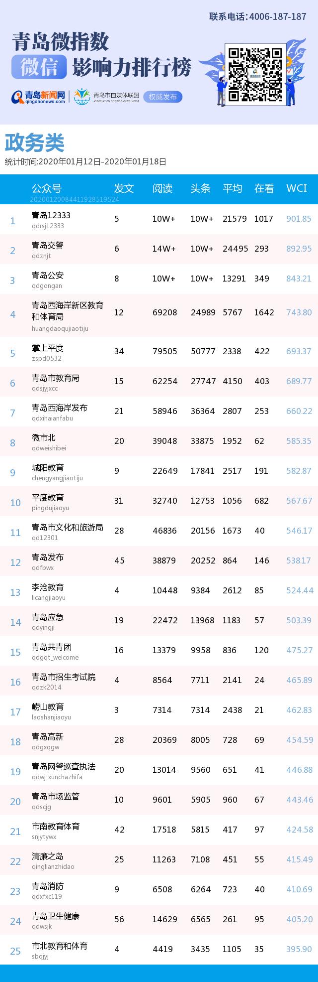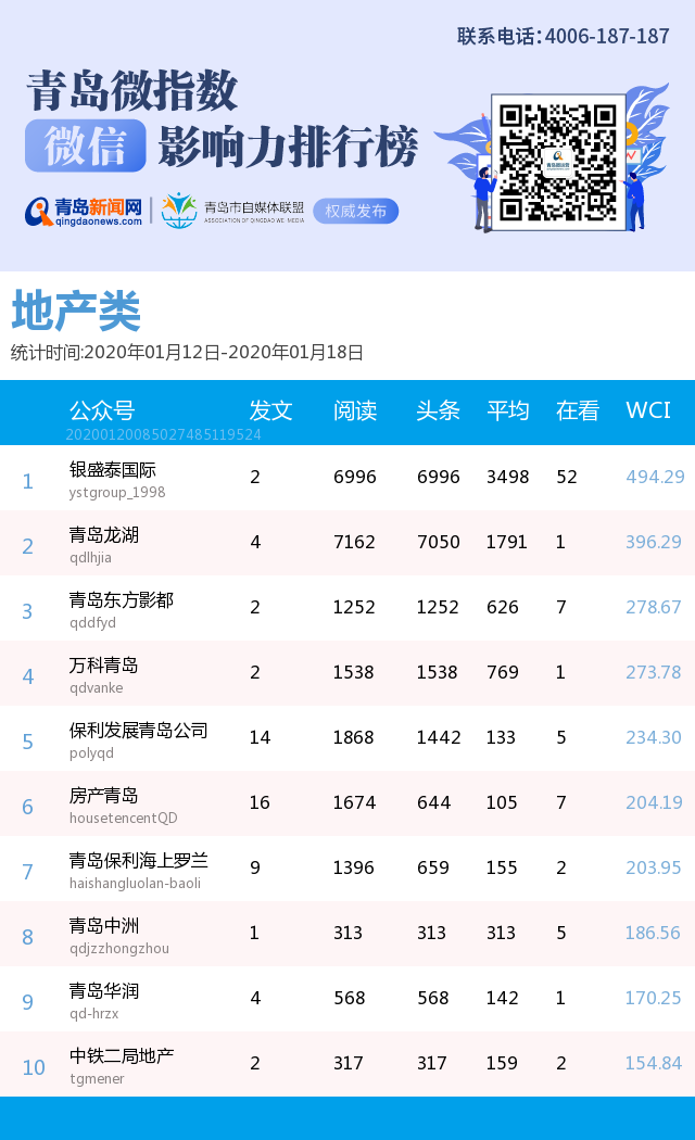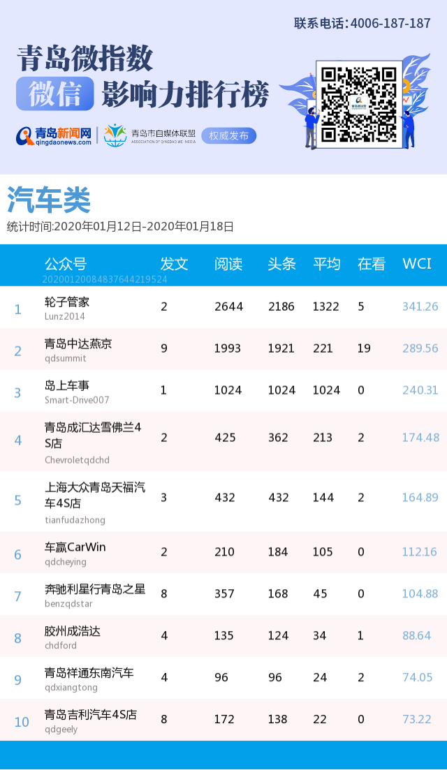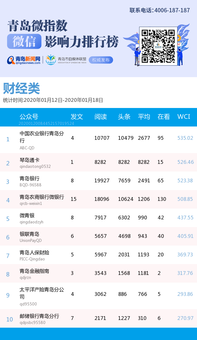3、本次榜單收錄了青島14個(gè)行業(yè)微信公眾號,如您的賬號暫未收錄,可聯(lián)系4006-187-187。