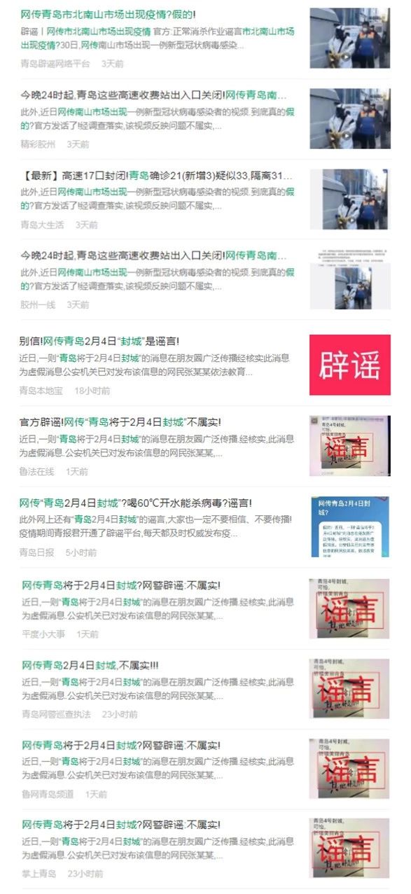 “辟謠!網(wǎng)傳青島公交停運(yùn),不屬實(shí)!”“辟謠!網(wǎng)傳2月4日青島封城不屬實(shí)!”……自新型冠狀病毒感染的肺炎疫情發(fā)生以來,青島自媒體主動(dòng)配合政府各部門積極辟謠,有效阻止了謠言的傳播。