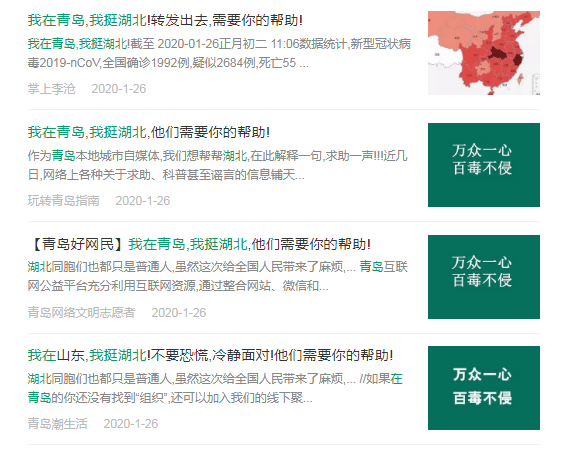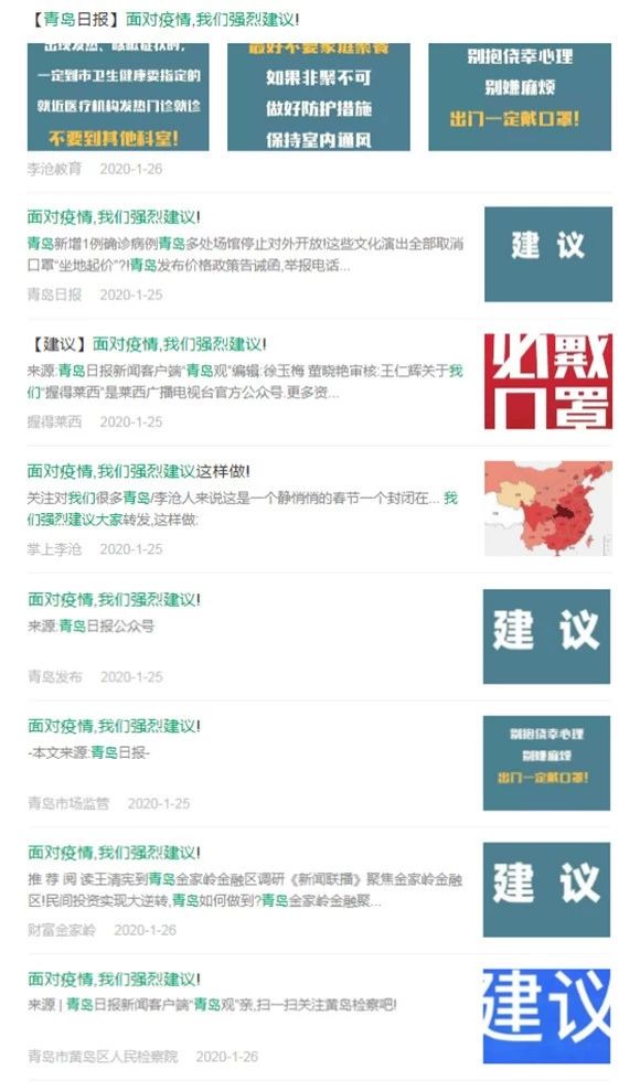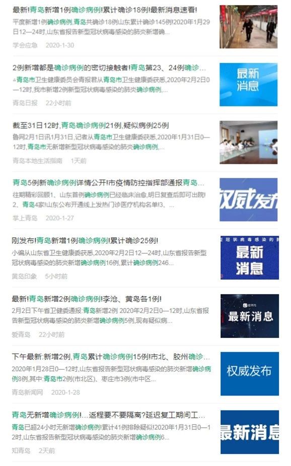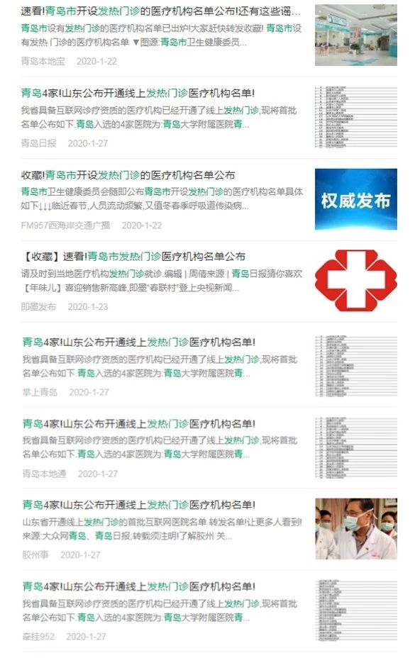 疫情發(fā)生后,青島市衛(wèi)生健康委官網(wǎng)發(fā)布青島市定點(diǎn)救治醫(yī)院名單,青島自媒體紛紛利用各自平臺(tái),及時(shí)發(fā)布青島發(fā)熱門診、醫(yī)療救治定點(diǎn)醫(yī)院名單,及時(shí)幫助疑似病例盡早得到救治。