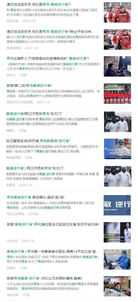 春節(jié)假期,當(dāng)人們都在家中規(guī)避疫情,他們卻迅速集結(jié),毅然奔赴沒有硝煙的戰(zhàn)場(chǎng),為了記錄這些義無反顧、揮手逆行的英雄,青島自媒體紛紛發(fā)出“請(qǐng)記住這些名字,他們是青島‘最美逆行者’”、“最美逆行者!兩口子把關(guān)青島‘東大門’”、“青島最美逆行者,推遲婚禮,奮戰(zhàn)‘疫’線”等報(bào)道。