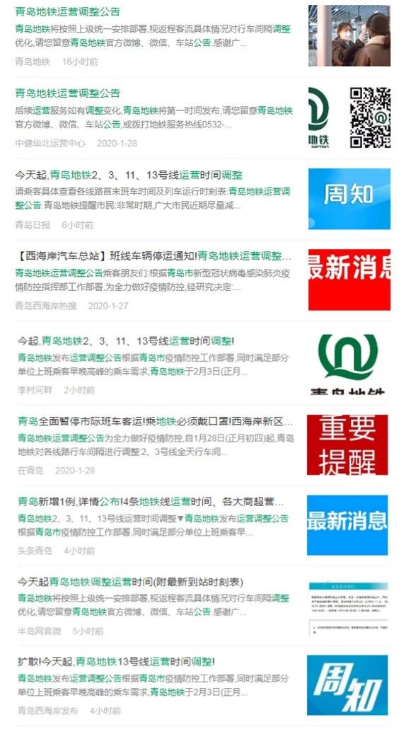 為全力做好疫情防控,青島地鐵、高速分別發(fā)布運(yùn)營調(diào)整公告,青島各大官微及時(shí)發(fā)布最新通知,自媒體積極配合傳播,提前幫助大家做好出行規(guī)劃,合理安排出行線路。