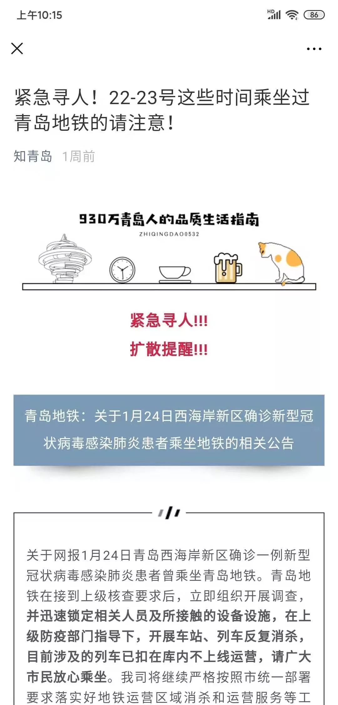 為最大限度防控疫情擴(kuò)散,除了做好最新疫情信息的通報(bào)外,青島各大官微密切關(guān)注已確診患者活動(dòng)軌跡,并及時(shí)發(fā)出“涉及青島!這235個(gè)車次、航班發(fā)現(xiàn)患者,急尋同行人!”、“緊急通知!青島這2例患者詳情公布:全程活動(dòng)軌跡線路請(qǐng)關(guān)注!”等報(bào)道,引發(fā)網(wǎng)友關(guān)注。