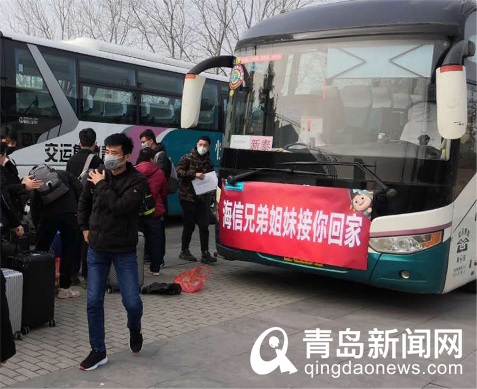 家在新泰的海信員工登上返青大巴車。