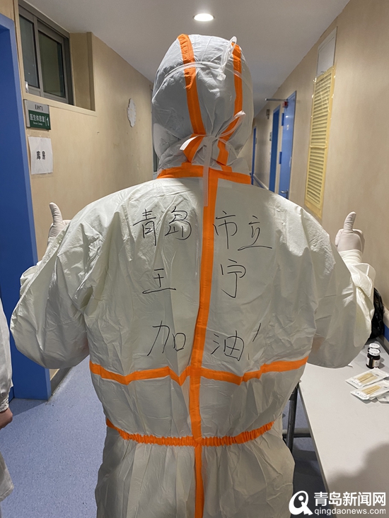 青島市市立醫(yī)院護(hù)士姜?。骸巴ㄟ^(guò)5道關(guān)卡進(jìn)入病房,隔著厚重的防護(hù),病人難以辨認(rèn)我們的模樣,但是鎮(zhèn)定的目光和防護(hù)服上那句“青島市立有我們?cè)趧e怕”,一定給了他們很大的信心。我和每個(gè)治療病人招手致意,用特殊的方式表達(dá)鼓勵(lì)支持。給我印象最深刻的是一個(gè)行動(dòng)不便的老爺爺,他對(duì)我說(shuō)了好多話,但是方言太重,我聽(tīng)不懂。最后,老爺爺深深鞠了一躬,我明白了。向他報(bào)以一個(gè)祝福的手勢(shì)?!?/p>