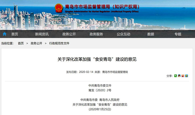 青島新聞網(wǎng)2月14日訊(記者 黃曉)“民以食為天,食以安為先?!苯陙?lái),黨中央、國(guó)務(wù)院高度重視食品安全工作,在全國(guó)范圍內(nèi)開(kāi)展了食藥安全“四個(gè)最嚴(yán)”專項(xiàng)行動(dòng)。青島也積極貫徹落實(shí)“四個(gè)最嚴(yán)”要求,打造“食安青島”品牌,成功創(chuàng)建為國(guó)家食品安全示范城市、國(guó)家農(nóng)產(chǎn)品質(zhì)量安全市。1月25日,青島市發(fā)布了《中共青島市委、青島市人民政府關(guān)于深化改革加強(qiáng)“食安青島”建設(shè)的意見(jiàn)》(以下簡(jiǎn)稱《意見(jiàn)》),緊密結(jié)合青島實(shí)際,為當(dāng)前和今后一個(gè)時(shí)期加強(qiáng)食品安全工作指明了方向,對(duì)推動(dòng)青島食品安全治理體系和治理能力建設(shè)做出了全面部署。