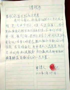 “我叫白林元,我是一名老黨員,也是一名退伍軍人,面對(duì)突如其來的疫情,應(yīng)沖在防疫第一線最前面。疫情就是命令,時(shí)間就是生命……我申請(qǐng)加入志愿者,為社區(qū)、為政府、為人民服務(wù),為打贏抗擊新型冠狀病毒肺炎貢獻(xiàn)自己的一點(diǎn)力量。”這是昌樂路社區(qū)第九網(wǎng)格的老黨員白林元一筆一字寫下的請(qǐng)戰(zhàn)書。白林元在得知社區(qū)全體工作人員都奮戰(zhàn)在疫情防控一線的消息后,立即寫下了按著紅手印的《請(qǐng)戰(zhàn)書》,積極向社區(qū)黨委申請(qǐng)加入社區(qū)志愿者隊(duì)伍,為打贏這場(chǎng)疫情防控阻擊戰(zhàn)貢獻(xiàn)自己的力量。頓時(shí),一呼百應(yīng),社區(qū)各網(wǎng)格的老黨員、老干部們紛紛請(qǐng)戰(zhàn),要求加入抗擊疫情的第一線,吹響“紅色集結(jié)號(hào)”,穿上志愿紅馬甲。